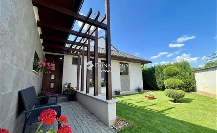 Az udvaron gyönyörű pázsit, ciprusok, a gyerekek részére faház, mászófallal, játszótérrel és 16 m2-es kerti tárolóval.