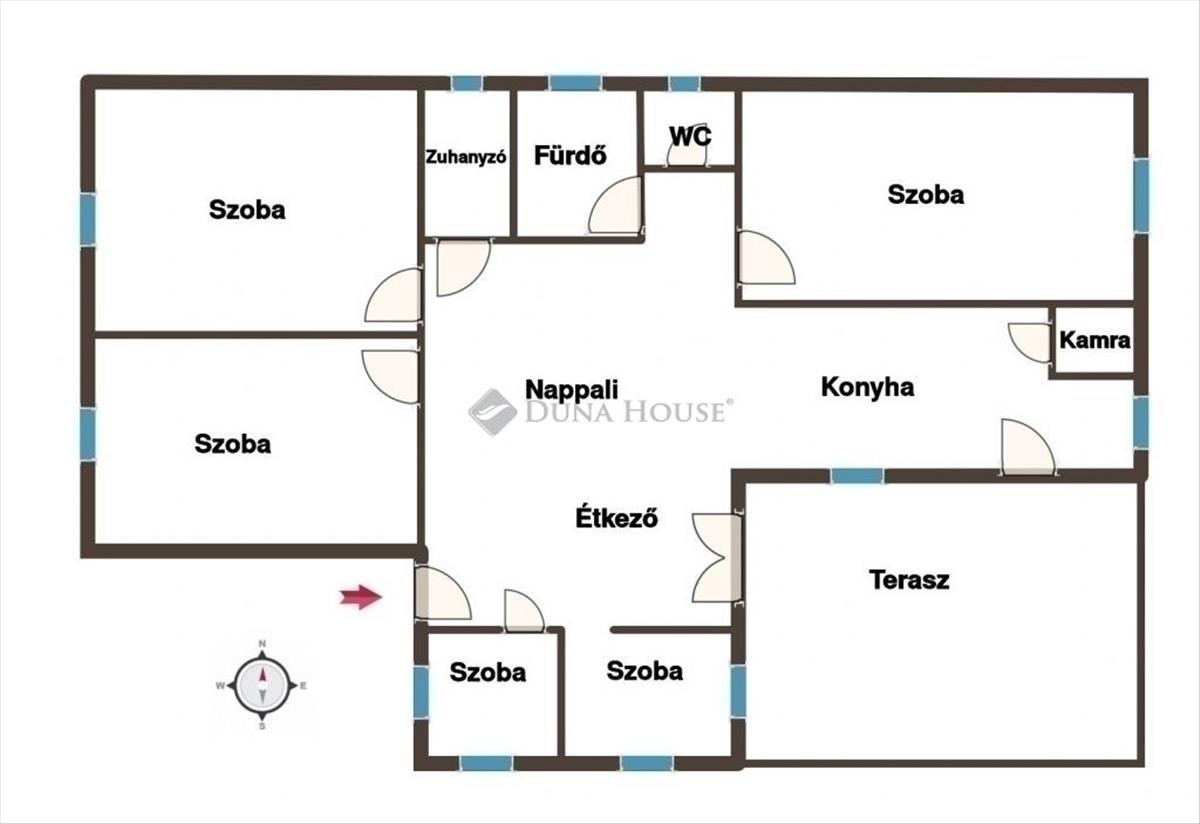 Az ingatlan jelenlegi kialakítása nappali + 5 szoba. a nappaliból két kisebb szoba került leválasztásra gipszkarton falakkal, amelyek igény esetén könnyedén visszabonthatók, így az eredeti, tágas nappali tér egyszerűen visszaállítható.