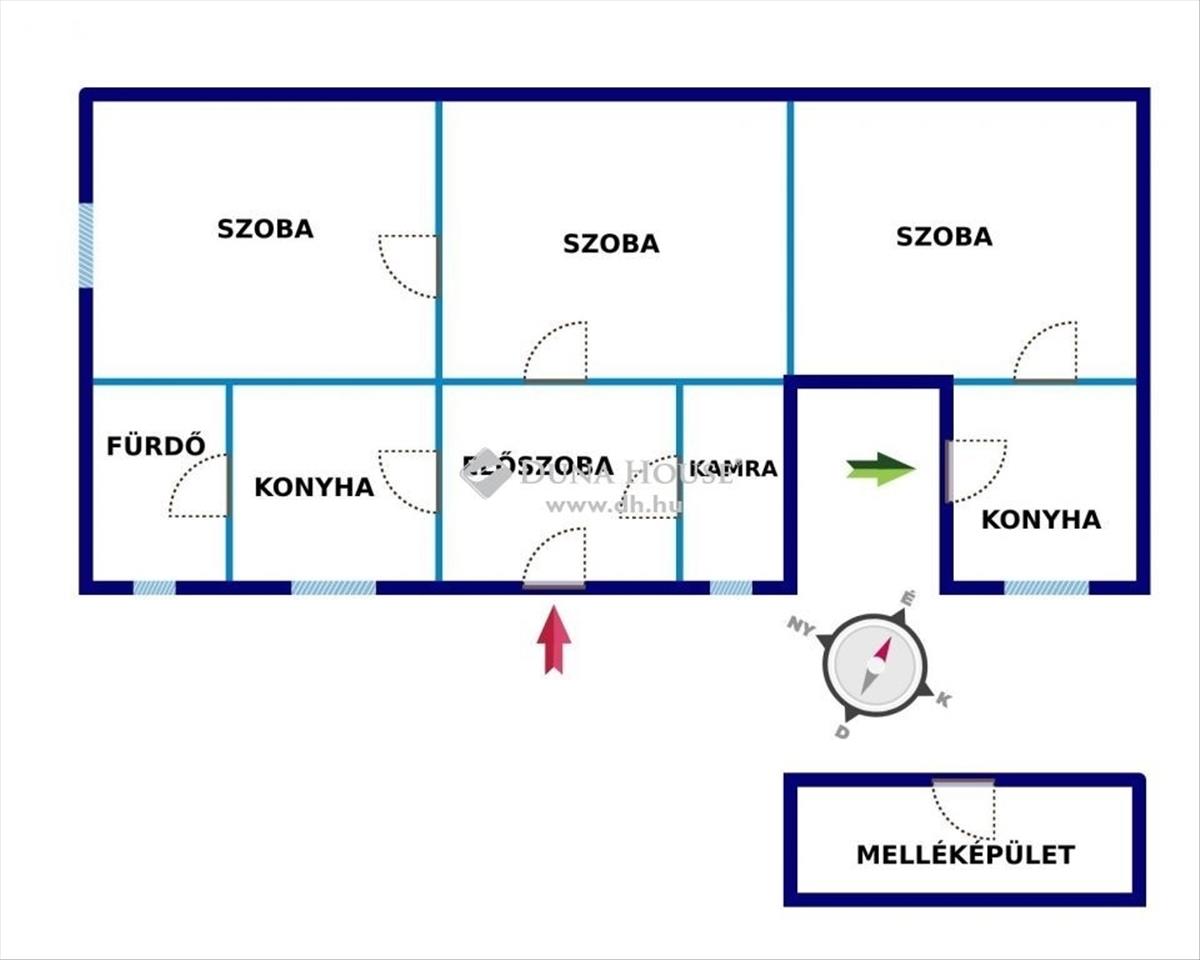 A 130 m2-es vályog épületben található 3 szoba, 2 konyha, fürdőszoba wc-vel és kamra.