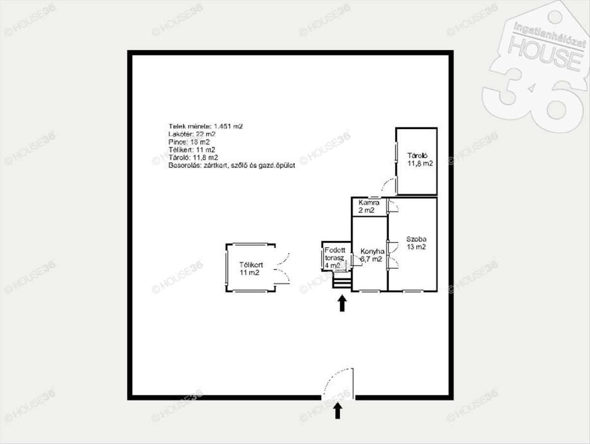 - Lakótér: 22 m2 (1 szoba, konyha, kamra)+ 4 m2 fedett terasz