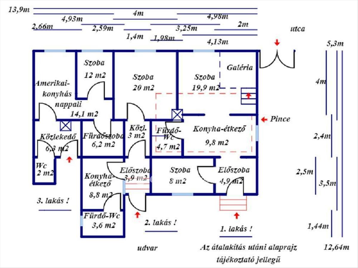 Bács-Kiskun vármegye, Kecskemét, Belvárosban 127 m2 hasznos alapterületű családi ház 342 m2 telken eladó. Az ingatlan a város központjában, csendes aszfaltozott utcában található. a családi ház jelenleg három külön bejáratú, két önálló lakórészből áll. Az első 47, 3 m2-es lakrészben két szoba, egy galéria, egy konyha-étkező, egy fürdőszoba-WC-helyiség és egy előszoba található. a második 80 m2-es lakrész két szobából, egy konyhából, egy fürdőszoba-WC-ből, három közlekedőből, egy előszobából és egy különálló WC-helyiségből áll. Az ingatlanhoz tartozik még egy több egységből álló, tárolásra alkalmas melléképület. a tégla falazatú összkomfortos nagypolgári ház az 1900-as évek közepén épült, stukatoros fa födémmel, fa tetőszerkezettel, valamint égetett cserép héjazattal készült. Nyílászárói részben normál állapotú fa, illetve újracserélt műanyagból készültek, a belső nyílászárók egy része felújításra szorul. Az épület homlokzata kiváló állapotú, felújított. a háznak két falazott és három szerelt kéménye van, melyből több kémény is gáz-béléscsővel rendelkezik. a helyiségek járólappal, laminált padlóval, parkettával, hajópadlóval, PVC-vel, valamint padlószőnyeggel burkoltak. a konyhák és a fürdő-WC helyiségek felújításon estek át. Az otthon melegét és melegvíz ellátását lakrészenként víz-átfolyós gázbojler, a fűtést gázkonvektor és gázkazán biztosítja radiátoros hőleadással, emellett vegyestüzelésű bekötési lehetőség is rendelkezésre áll. Az ingatlan összközműves: lakrészenként a vezetékes víz, szennyvíz csatorna, egyfázisú villany és gáz az épületen belül rendelkezésre áll. Mérőórák szerint a villany és a gáz lakásonként külön mérhető. Az udvar részben parkosított, körben bekerített, gépjárművek beállására kapubejáró biztosított. a családi ház kialakítása miatt ideális lehet többgenerációs lakhatásra, három külön bejáratú lakás bérbe adására, 7 egységből álló rendelővé, irodává, egyéb szolgáltatóházzá való átalakításra egyaránt. Az udvari mellékhelyiségek lebontásával 5 gépjármű parkolása is megoldhatóvá válik. a vásárlás finanszírozásában az OTP kedvezőbb kamatozású hitelkonstrukcióival, CSOK Plusz lehetőségével tudunk segíteni. Az adásvételi szerződés lebonyolításához korrekt ügyvédi közreműködést tudunk ajánlani. Amennyiben felkeltettem érdeklődését, hívjon bizalommal! Eladó ingatlanokat keresünk hazai, illetve külföldi partnereink számára. FIX 3% lakáshitelre megvehető
