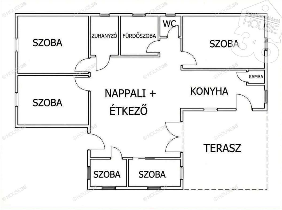 - nappali + 3 egész szoba + 2 félszoba