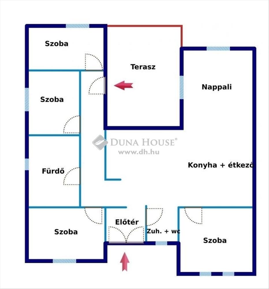 – 4 szobát (amerikai konyha-nappali-étkező + 3 hálószoba);