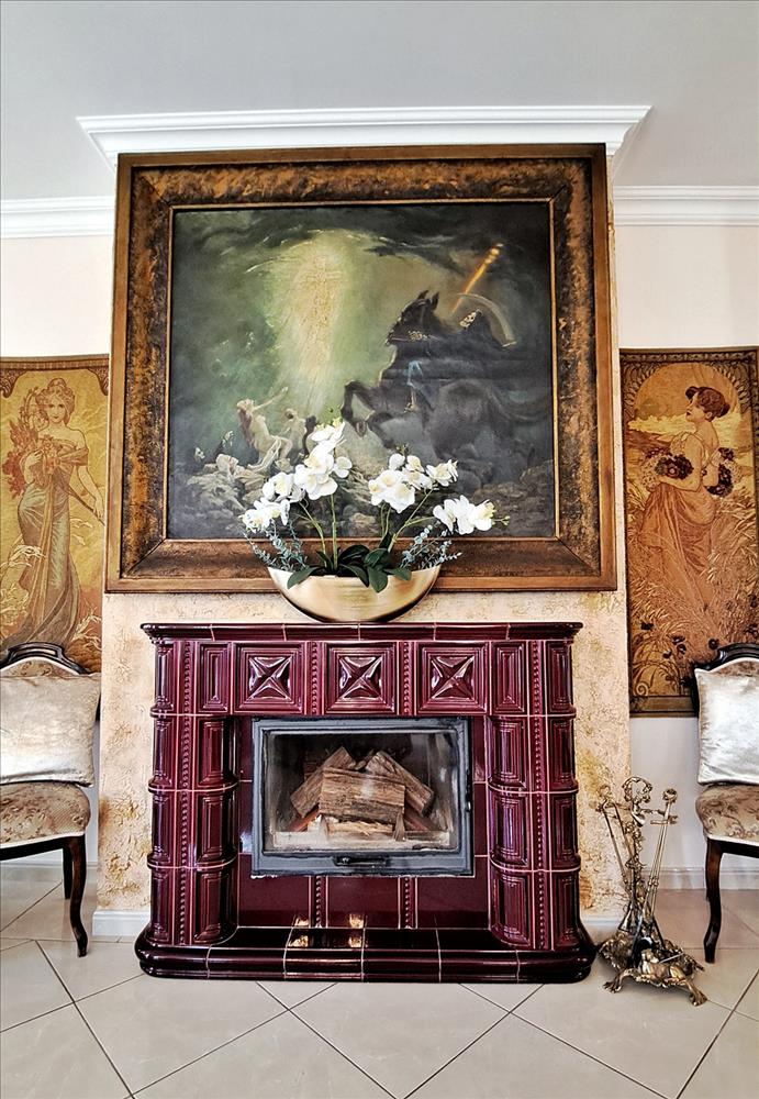 A nappalihoz tartozik egy gyönyörű kandalló is, amely nemcsak a téli estéket varázsolja meghitté, hanem egyedi hangulatot is ad az otthonnak.