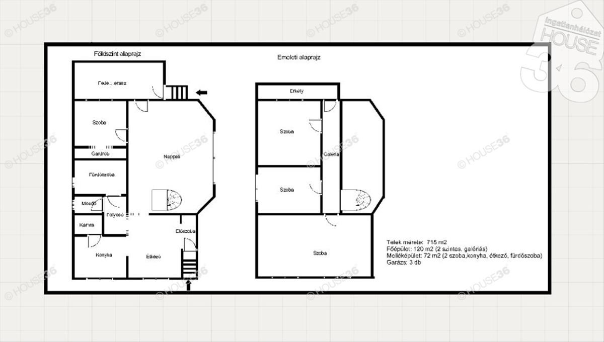 Főépület (120 m2): nappali+4 szoba, étkező-konyha, kamra, 2 fürdőszoba, fedett terasz (20 m2) és erkély (5 m2)