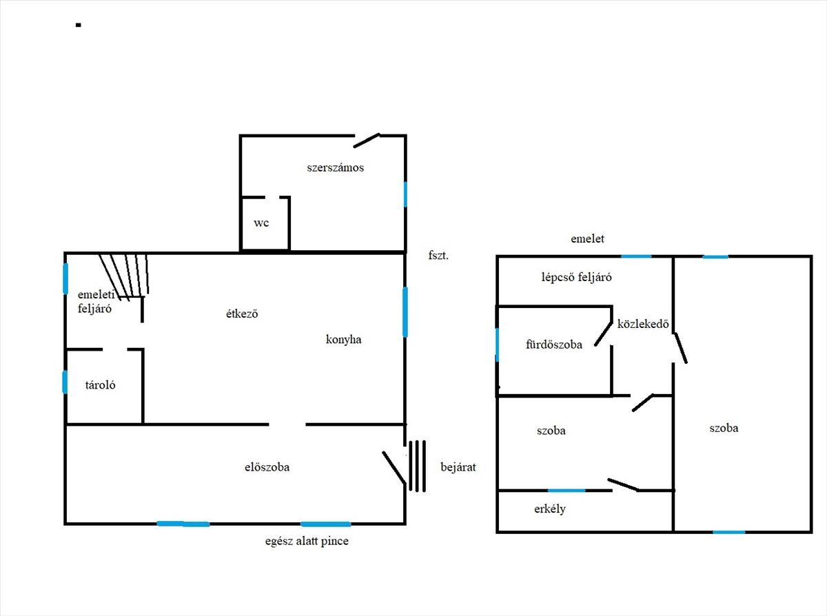 Emelet: 2 külön nyíló szoba, fürdőszoba, mosdó, közlekedő