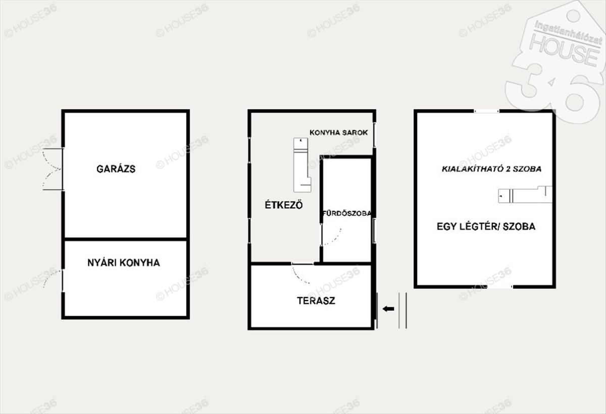 Jelenleg a földszinten található az étkező, konyha és a fürdőszoba, az emeleten jelenleg 1 szoba található, melyet könnyen 2 külön szobává alakíthatunk.