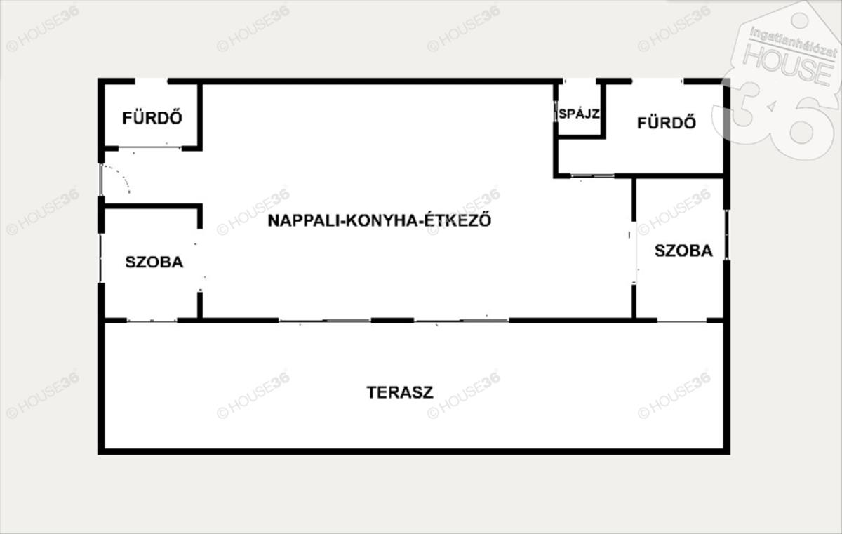 Praktikus elrendezés: 2szoba, plusz nappali, konyha és étkező egyben, valamint 2 fürdőszoba (1 kádas és 1 zuhanyzós).