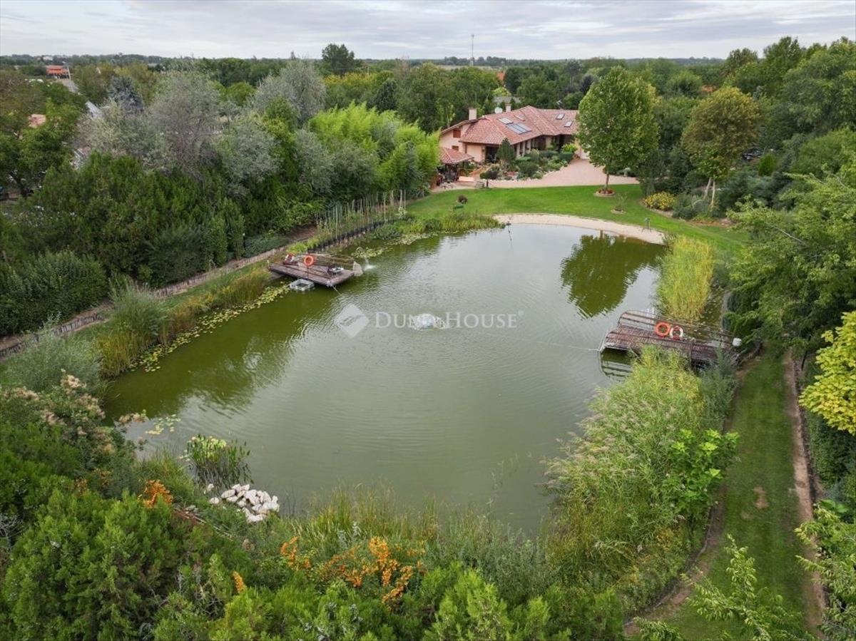 Az udvar különlegessége a 2 250 m² vízfelületű, 2, 5 méter mélységű speciális tófóliával ellátott kerti tó, mely kivételes hangulatot kölcsönöz az ingatlannak.