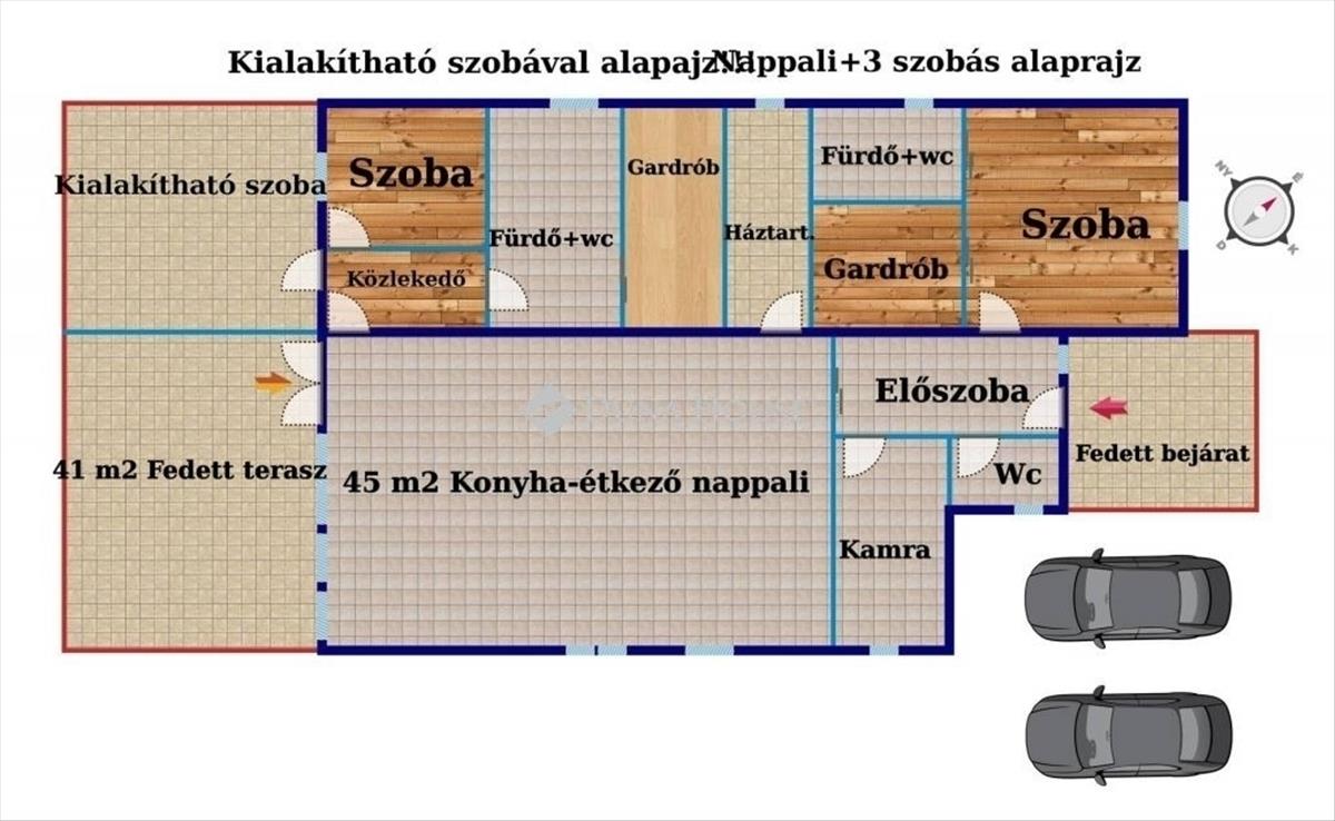 A ház nagy nappalival, két külön lakosztállyal (háló–gardrób–fürdő–WC), háztartási helyiséggel, kamrával és vendégmosdóval rendelkezik. a 41 m²-es fedett terasz igény szerint beépíthető, akár egy plusz szoba számára is.