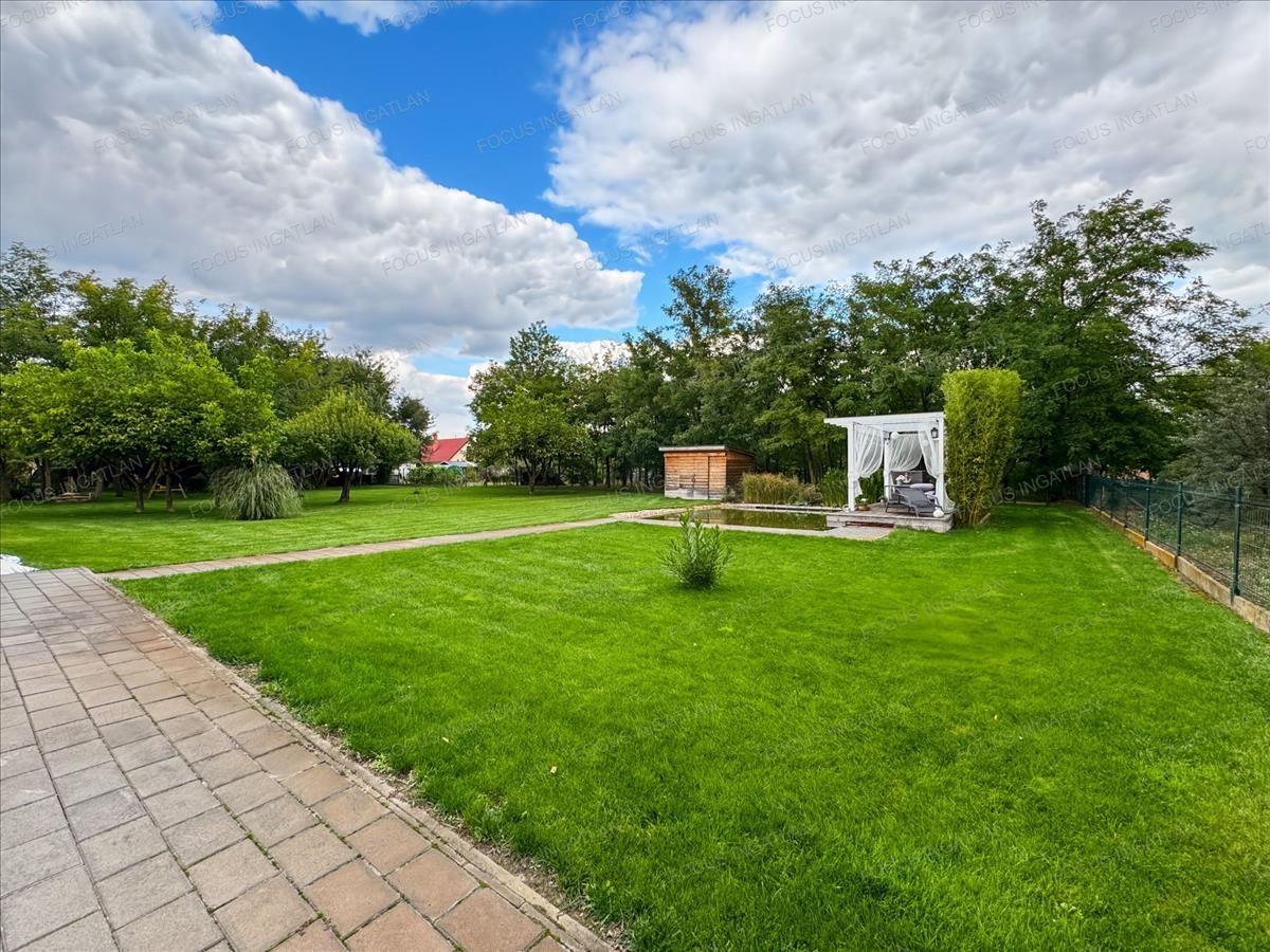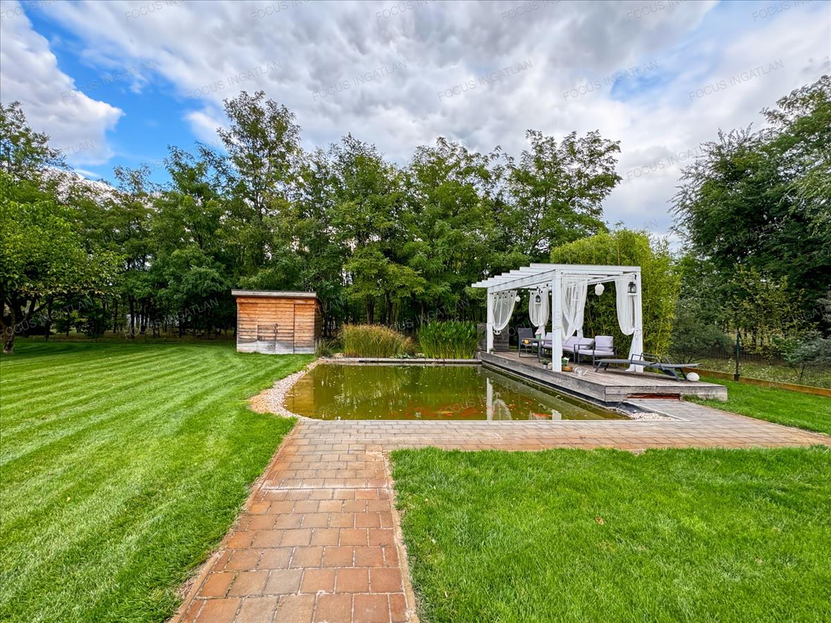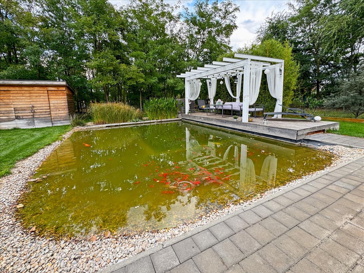 Kert: Automata, 4 zónás öntözőrendszer (fúrt kútról), dísztó, érett növényzet és hangulatos térkövezés.