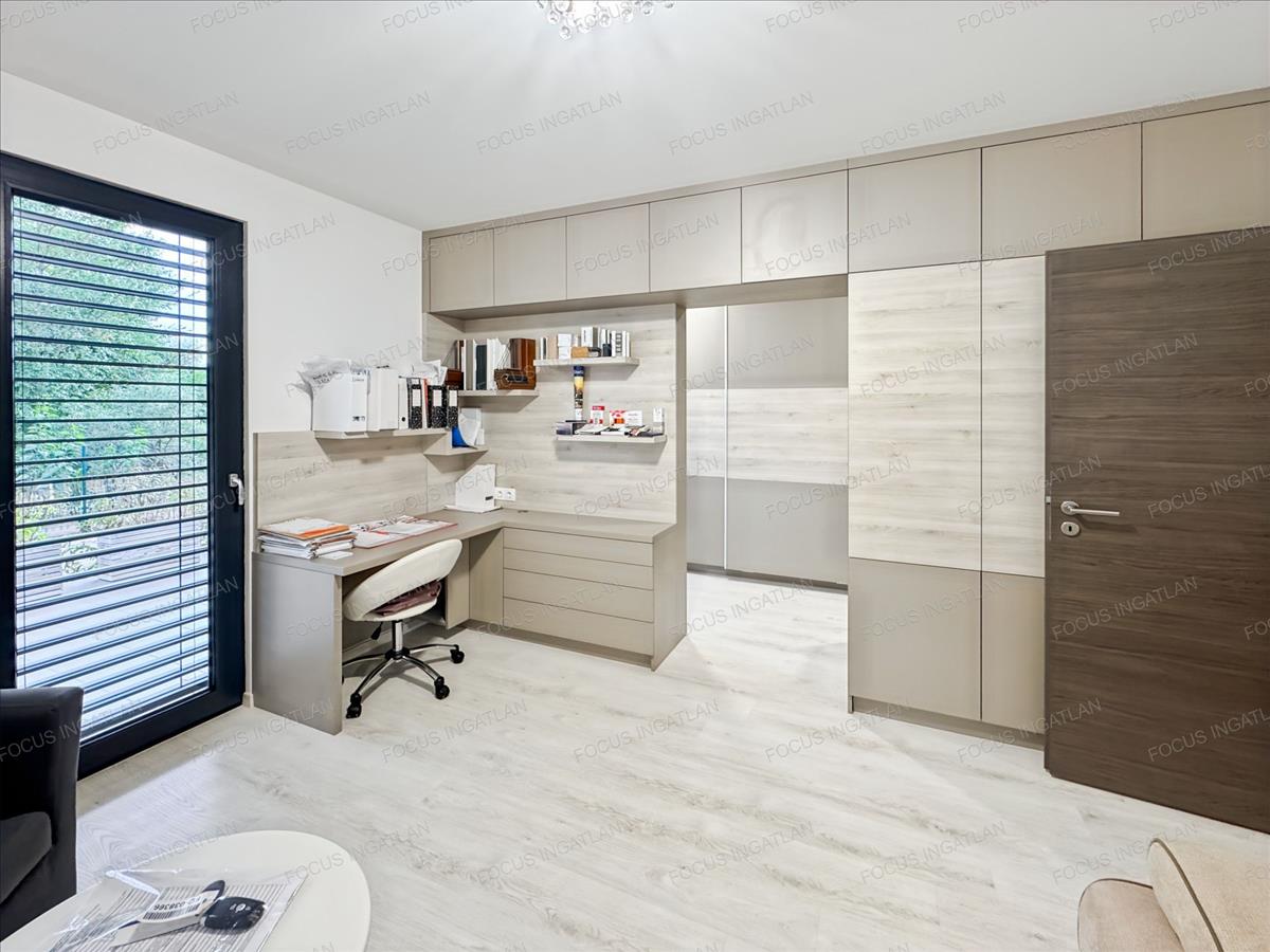 Földszint: a tágas, napfényben úszó amerikai konyhás nappali és étkező a ház központja, mely közvetlen kapcsolatot ápol a terasszal. Itt található továbbá egy szülői háló gardróbbal, egy praktikus háztartási helyiség, kamra és a vendég WC.