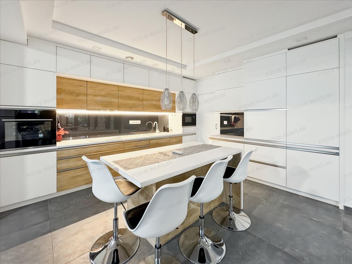Konyha: a háziasszonyok álma – egyedi tervezésű, magasfényű bútorzat, beépített prémium Electrolux gépekkel és konyhaszigettel.