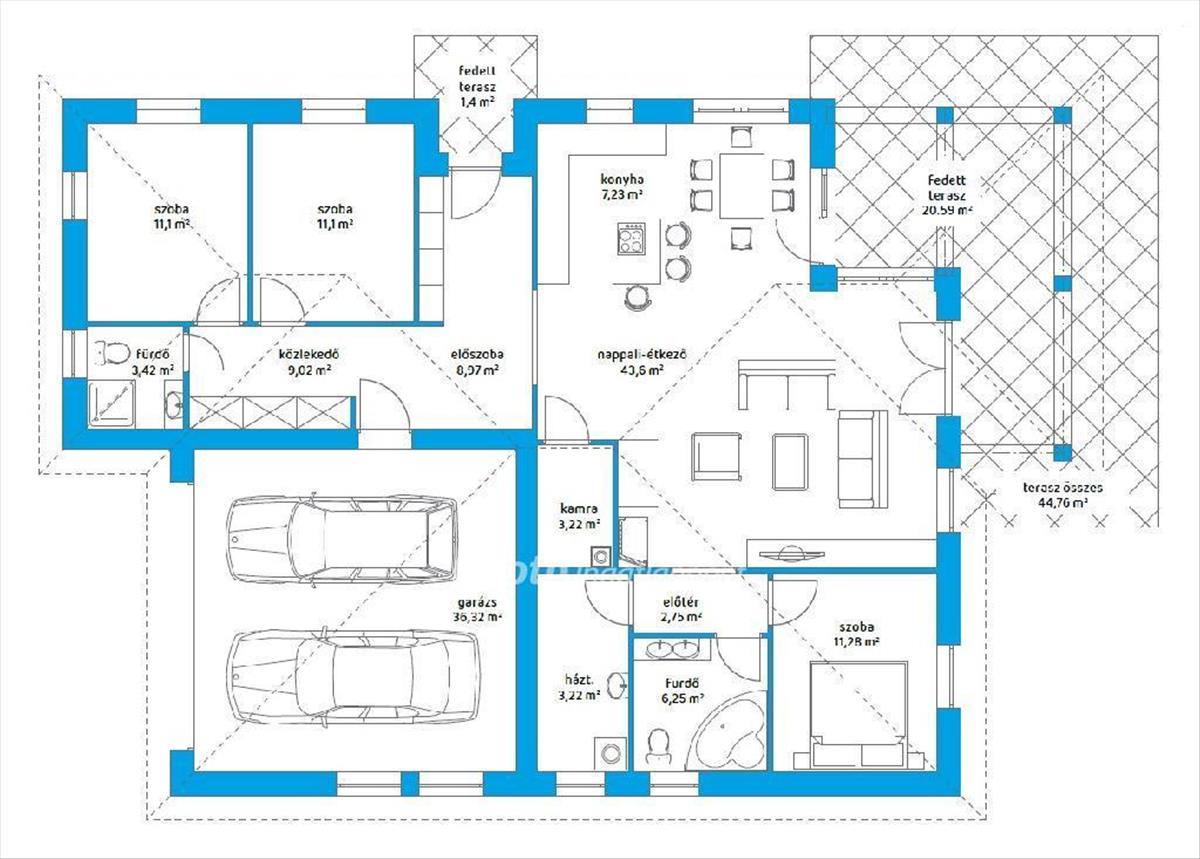 Bács-Kiskun vármegye Kecskemét, 150 m2-es új építésű téglaház, 46, 16 m2-es részben fedett terasszal, 36, 32 m2-es garázzsal, kiváló műszaki tartalommal kulcsrakész állapotban eladó. Amerikai konyhás nappali, 3 szoba, 2 fürdőszoba WC-vel, háztartási helyiség, kamra, közlekedő, előtér és előszoba kerül kialakításra. Az otthon melegét levegő-víz rendszerű hőszivattyú biztosítja, padlófűtésen keresztül. Az alábbi műszaki tartalommal: Falazata 38-as Porotherm tégla, 12 cm-es homlokzati hőszigetelés, szeglemezes tetőszerkezet választható színű Terran betoncseréppel, hidegburkolat 7. 500 Ft/m2, melegburkolat 5. 500 Ft/m2, szaniterek 750. 000 Ft-ig. Továbbá Prémium műszaki tartalom is elérhető, illetve egyedi igények szerint alakítható. Ez az alaprajz típusterv, amely tetszés szerint módosítható. a kivitelezési idő 10-12 hónap kulcsrakészen átadással. Az ár az alapozás költségét is tartalmazza, de a telek árat nem. ÁFA-visszatérítés, CSOK támogatás, államilag támogatott és Zöld Otthon lakáshitel igényelhető. Teljes körű és díjmentes banki termékek ügyintézésével állunk rendelkezésére sorban állás nélkül! További információ miatt keressen bizalommal!Referencia szám: m248687 FIX 3% lakáshitelre megvehető