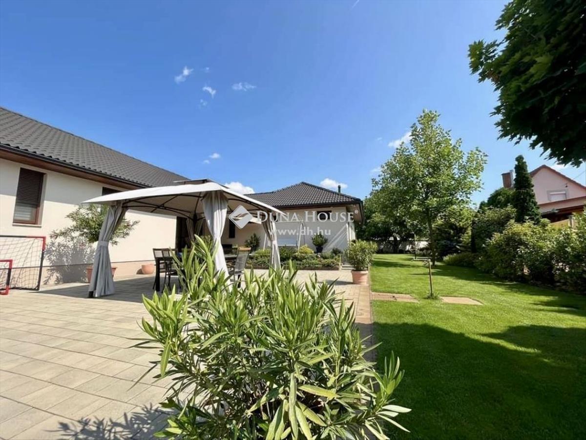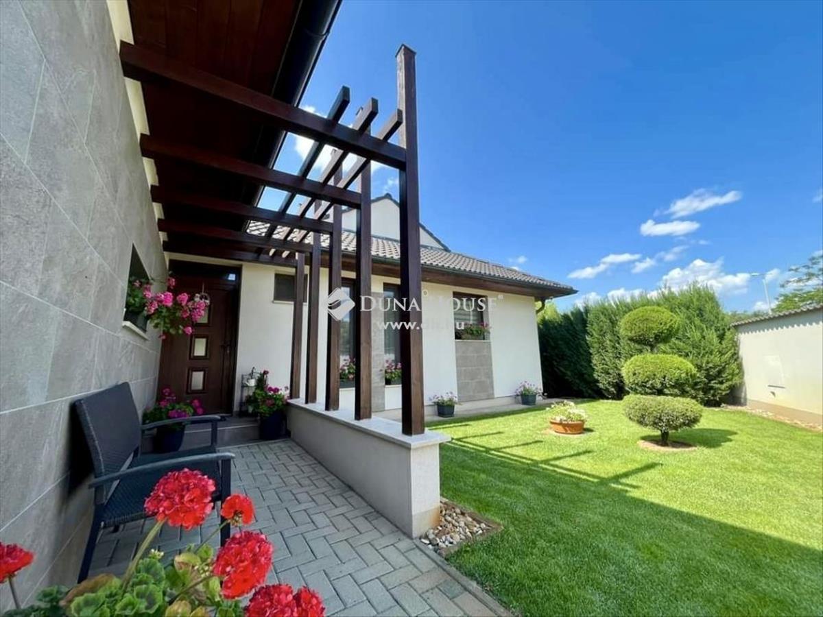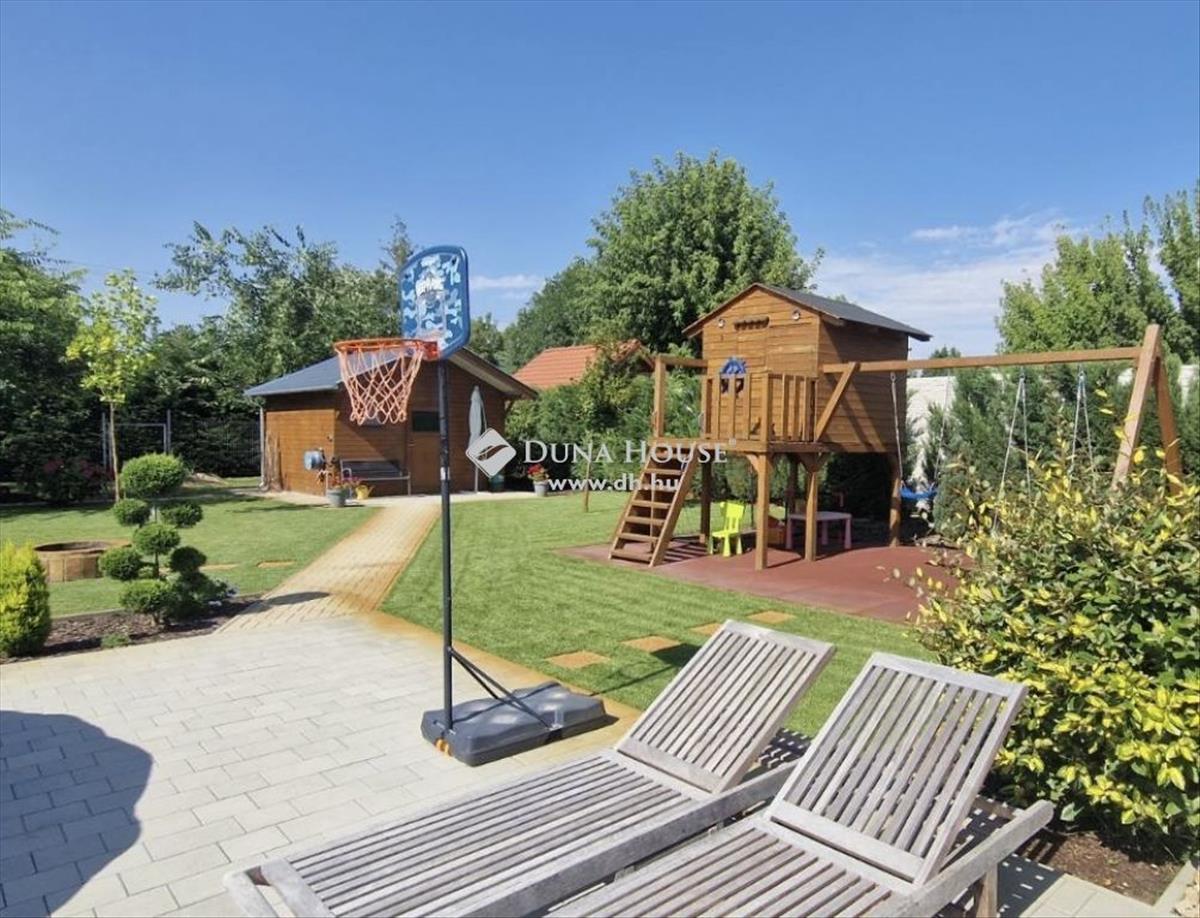 Kecskemét egyik legkedveltebb városrészében, közvetlen betonút mellett, 2016-ban épült, 145 m2 hasznos alapterületű, nappali + 3 szobás +gardrób + háztartási helyiség elosztású, egyszintes családi ház, dupla garázzsal, terasszal, térkövezett és gyönyörűen parkosított 1. 439 m2 területtel! Az udvaron gyönyörű pázsit, ciprusok, a gyerekek részére faház, mászófallal, játszótérrel és 16 m2-es kerti tárolóval.
