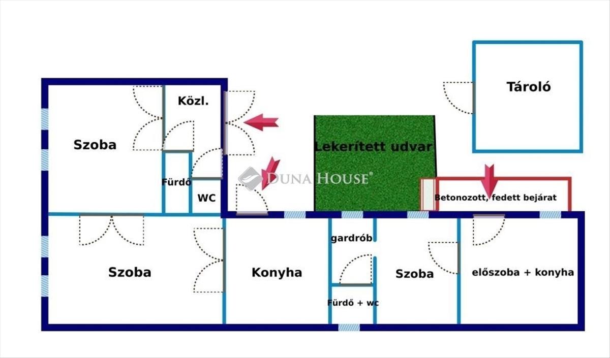 Jelenleg két rendbeli lakrész / 70 + 50 nm / helyezkedik el rajta lekerített udvarrésszel és külön közmű órákkal.