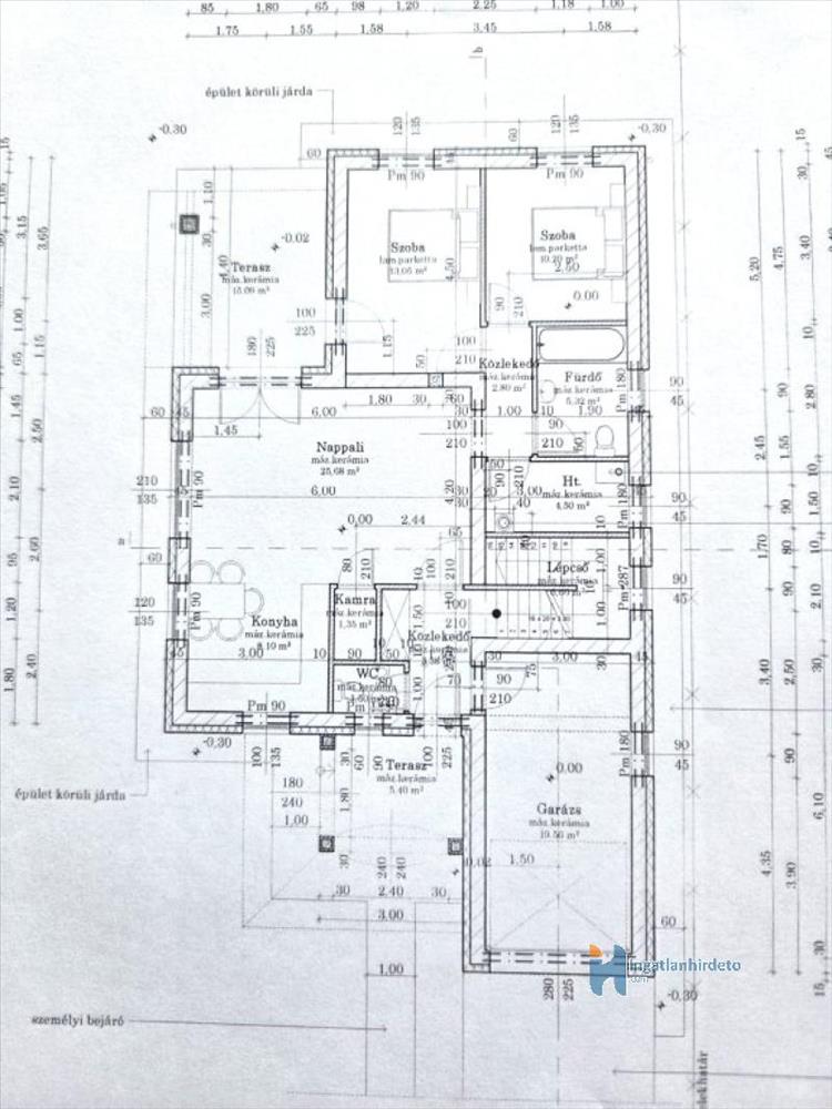 Földszinten a lakótér 82 m2, a garázs 20 m2, terasz 15 m2 és 5 m2.