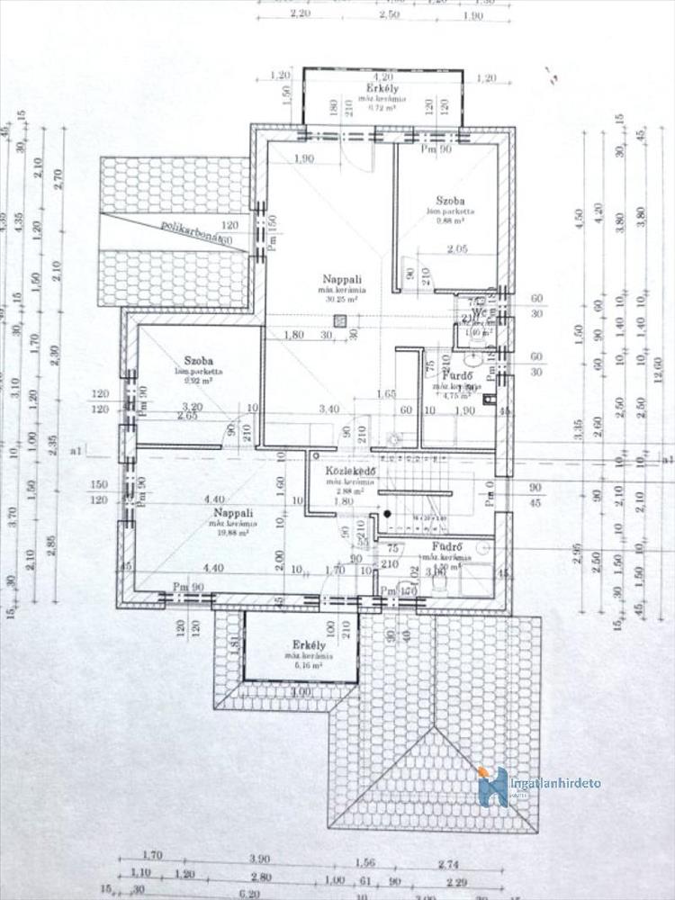 Tetőtér beépíthetősége 84 m2, erkély 7 m2 és 5 m2.