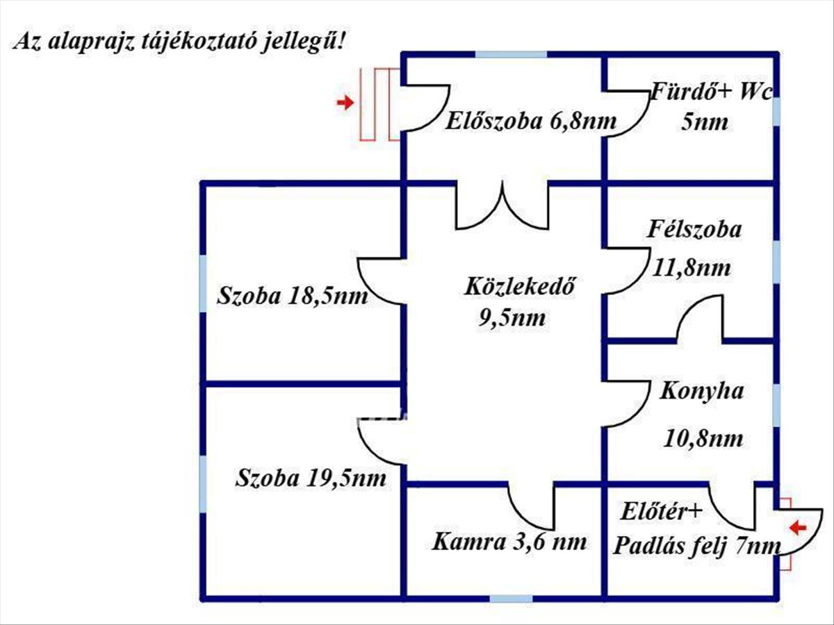 Belső elrendezés: előtér, fürdőszoba WC-vel, konyha, kamra, közlekedő, 2, 5 tágas szoba, padlásfeljáró
