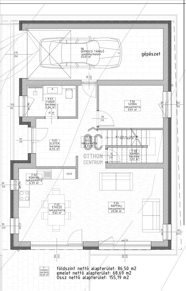 Az épület garázzsal és kocsibeállóval épül, összesen 155 m²-es hasznos alapterülettel.
