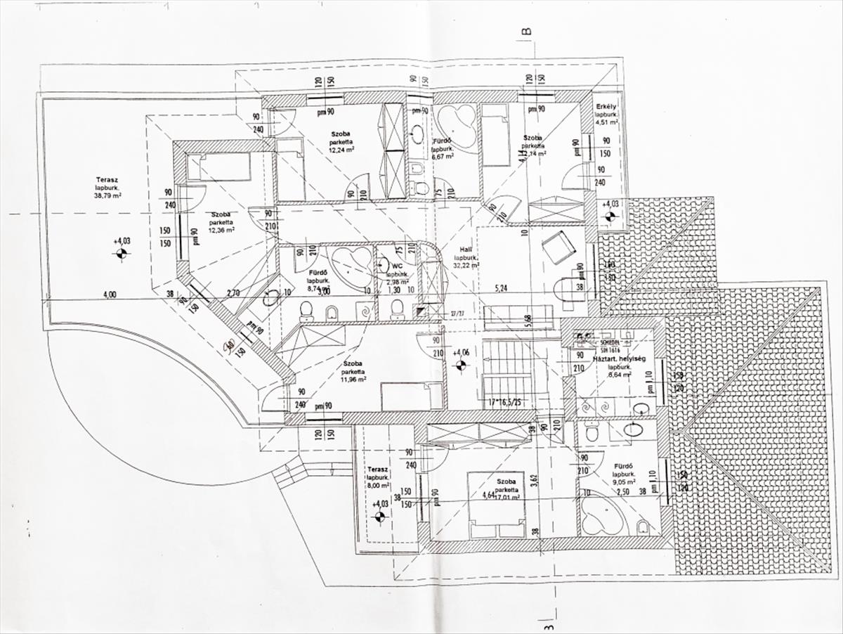 Emeleten rendelkezésünkre áll egy hall, 4 db hálószoba, ( 2 szobához terasz is tartozik + 2 db fürdőszoba.