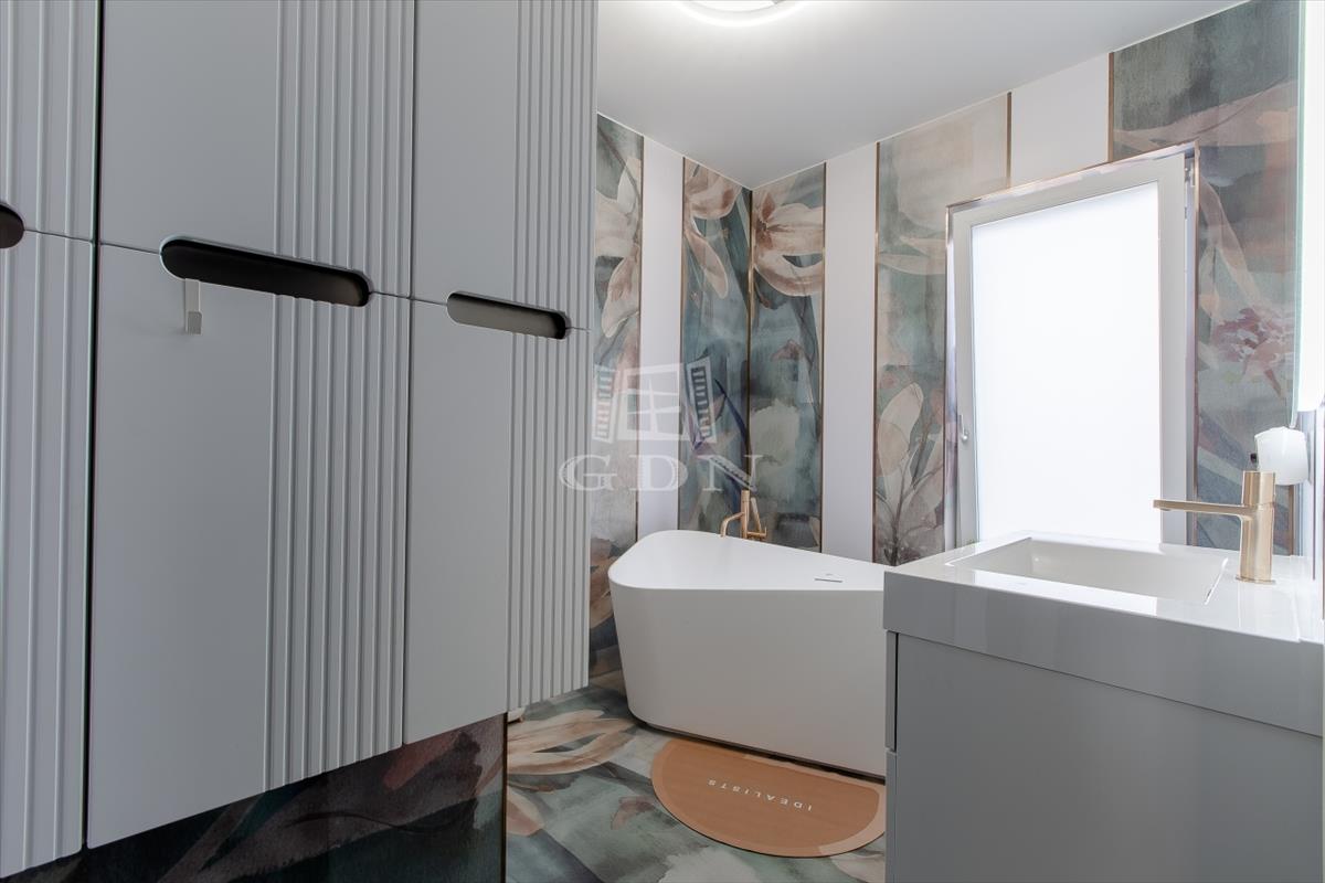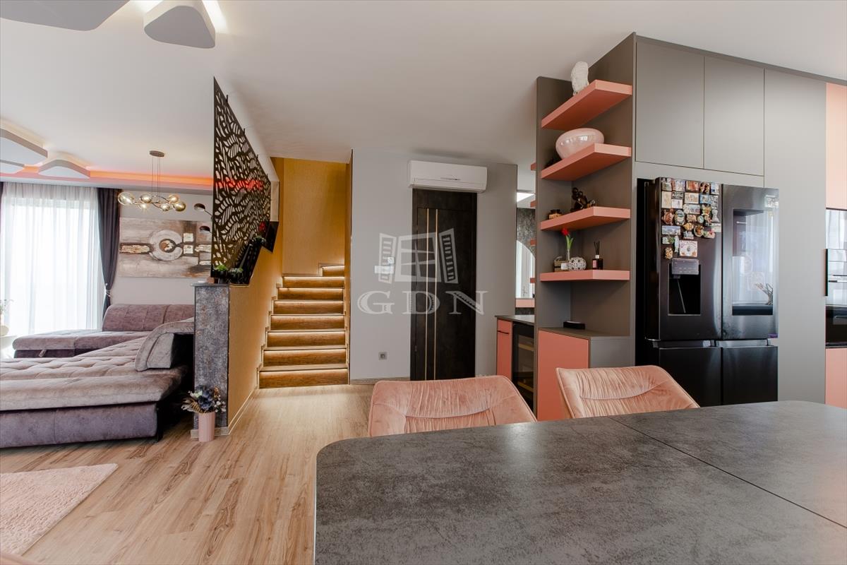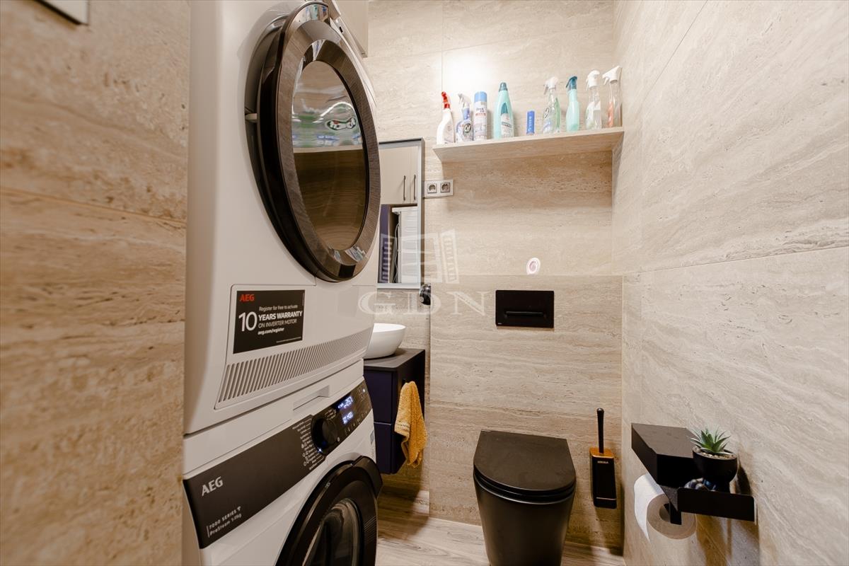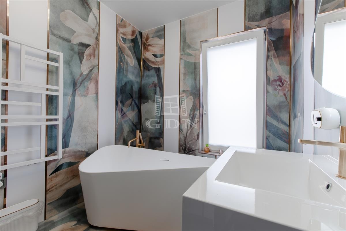 A tágas, világos nappali berendezve várja új tulajdonosát, a fürdőszobákban pedig felső kategóriás, bronz és rosegold színekben pompázó tres csaptelepek és zuhanyok, valamint érintésmentes szappanadagolók és szemetesek szolgálják a kényelmet.