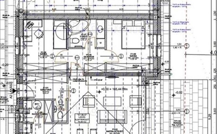 - földszintes teraszos házrész helyiségei: szélfogó, wc, nappali – étkező, konyha, kazán-kamra, gardrób, fürdőszoba káddal, mosdóval, WC-vel, 2 szoba, tároló - garázs, terasz