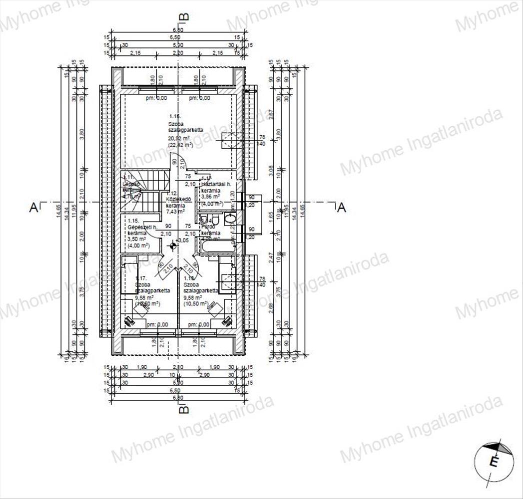 közlekedő, háztartási helyiség, fürdőszoba, gépészeti helyiség, valamint három külön nyíló hálószoba (20, 52 m², 9, 58 m² és 9, 58 m²).
