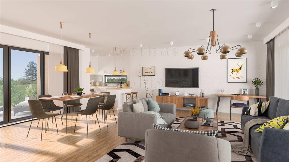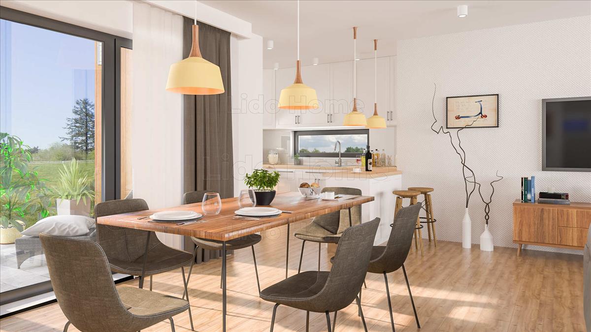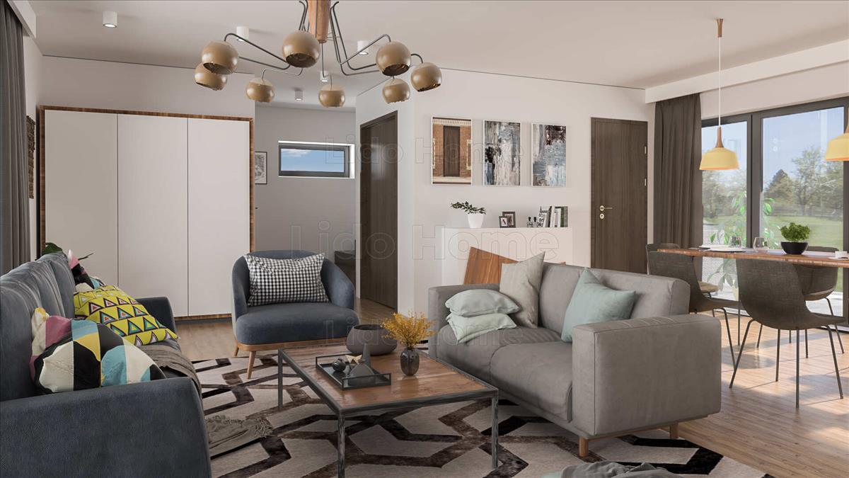 Dupla garázson keresztül juthatunk fel az első szintre ahol az egybe nyitott tér, ideális a hétköznapok színterére.