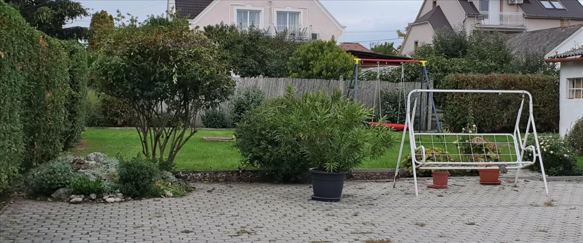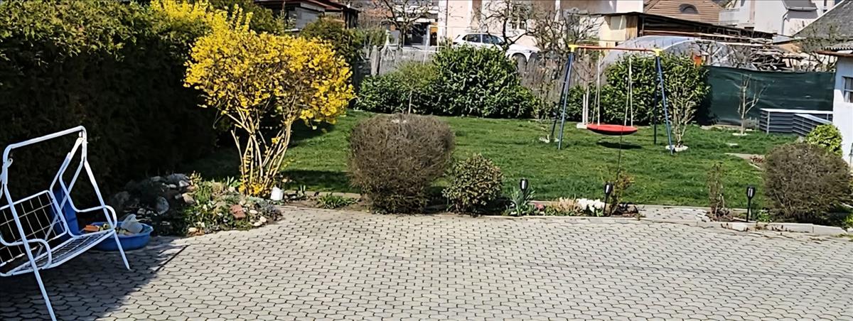 •teljesen zárt részben térkövezett udvar, gondozott kert