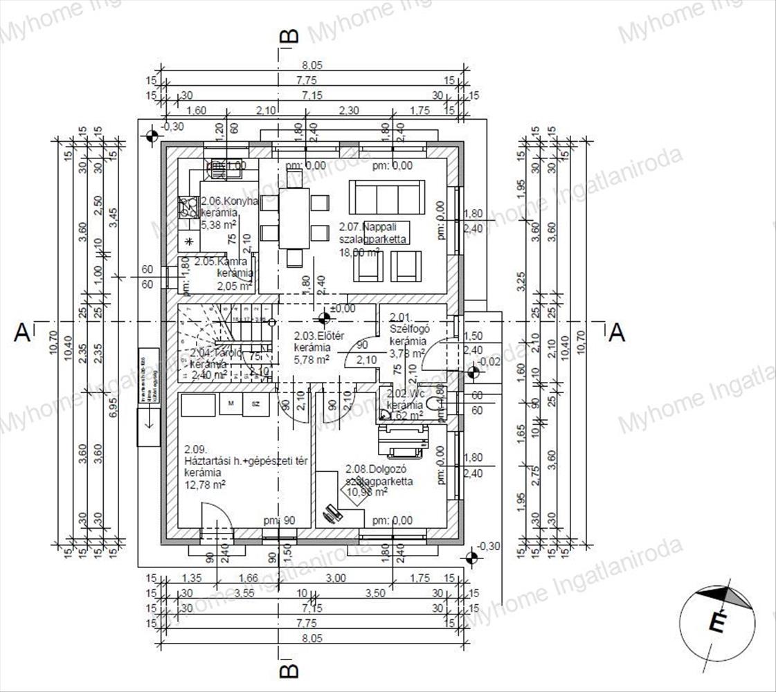 szélfogó, külön wc, előtér, tároló, kamra, konyha, 18 m²-es nappali, dolgozószoba, valamint egy tágas háztartási helyiség.