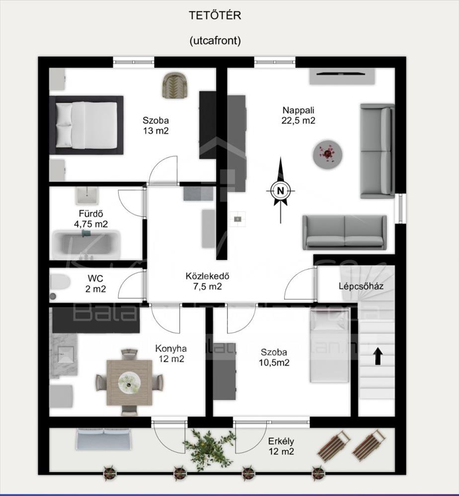 Felső szinten található 3 szoba nappalival, 1 nagyobb konyha, külön fürdő, külön toalett, közlekedő, nagyobb erkély.