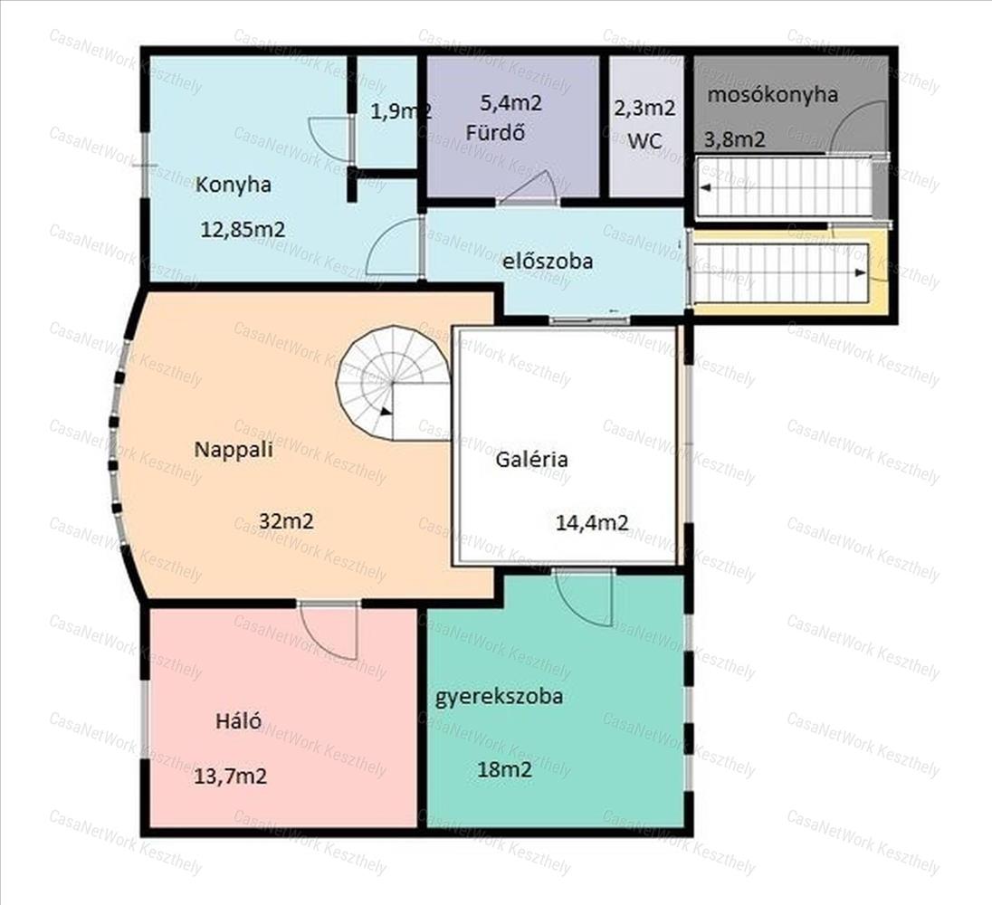 Emeleti szint: 3 szoba, ebből a 32 m²-es nappali galériás kialakítású, előszoba, konyha, spájz, fürdőszoba, wc, összesen 120 m².