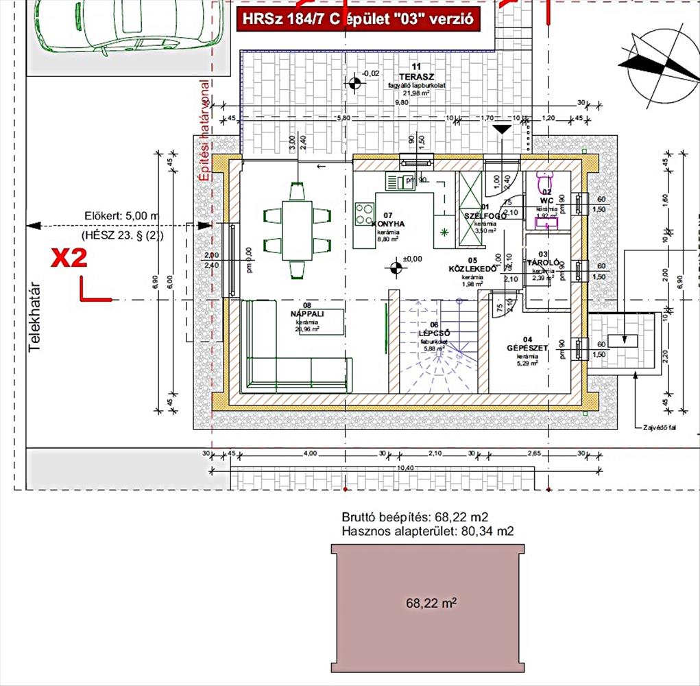 A házba belépve egy kényelmes méretű előszobába érkezünk. Az előtérből nyílik egy külön wc kézmosóval. Jobbra egy igazán tágas nappali konyha-étkezővel egy légtérben, ahonnan közvetlenül léphetünk ki a tágas, 22 m2-nyi, nyugati fekvésű, burkolt teraszra. a konyhával szemben a tőtérbe vezető lépcső érhető el. a közlekedő végéből nyílik egy tároló helyiség, mellette a háztartási helyiség, melyben a gépészet kap helyet.