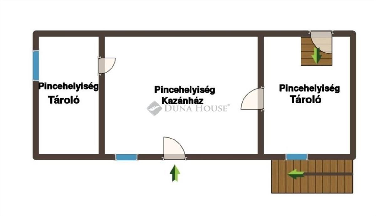 A házba lépcsőn érkezünk az előtérbe. Szemben a padlásfeljáró található. Jobbra pedig egy folyosóra lépünk, melyből három tágas szoba, pincelejáró, konyha, kamra, és egy fürdőszoba nyílik, ami a WC-t is magába foglalja.