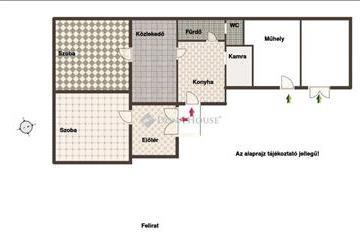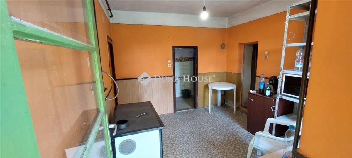 A két nagy szobán túl közlekedő, pici konyha, kamra, fürdő és külön wc található még a ház első részében. Az udvarról juthatunk be a kamrával falszomszédos műhelybe, valamint abba a helyiségbe, melynek a fala rongálódott.