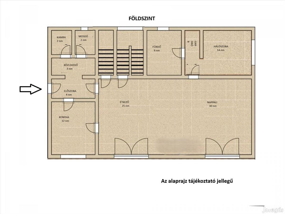 Földszinten Miele gépekkel felszerelt konyha, stílusosan berendezett étkező – nappali, egyedi bútorokkal, beépített kandalóval és bárszekrénnyel lenyűgöző látványt nyújt. Ezenkívül egy előszoba, gardrób szoba, fürdőszoba, hálószoba, wc, tároló található a szinten.