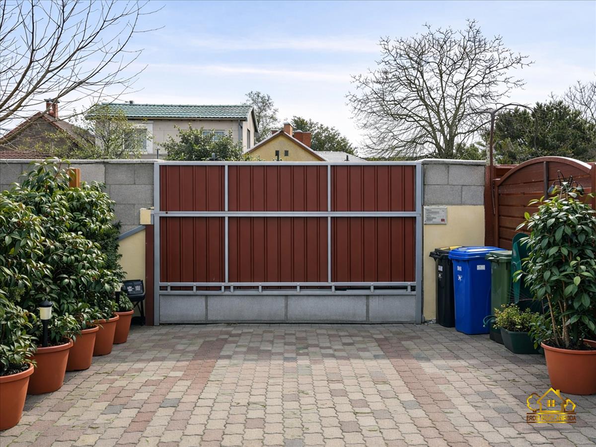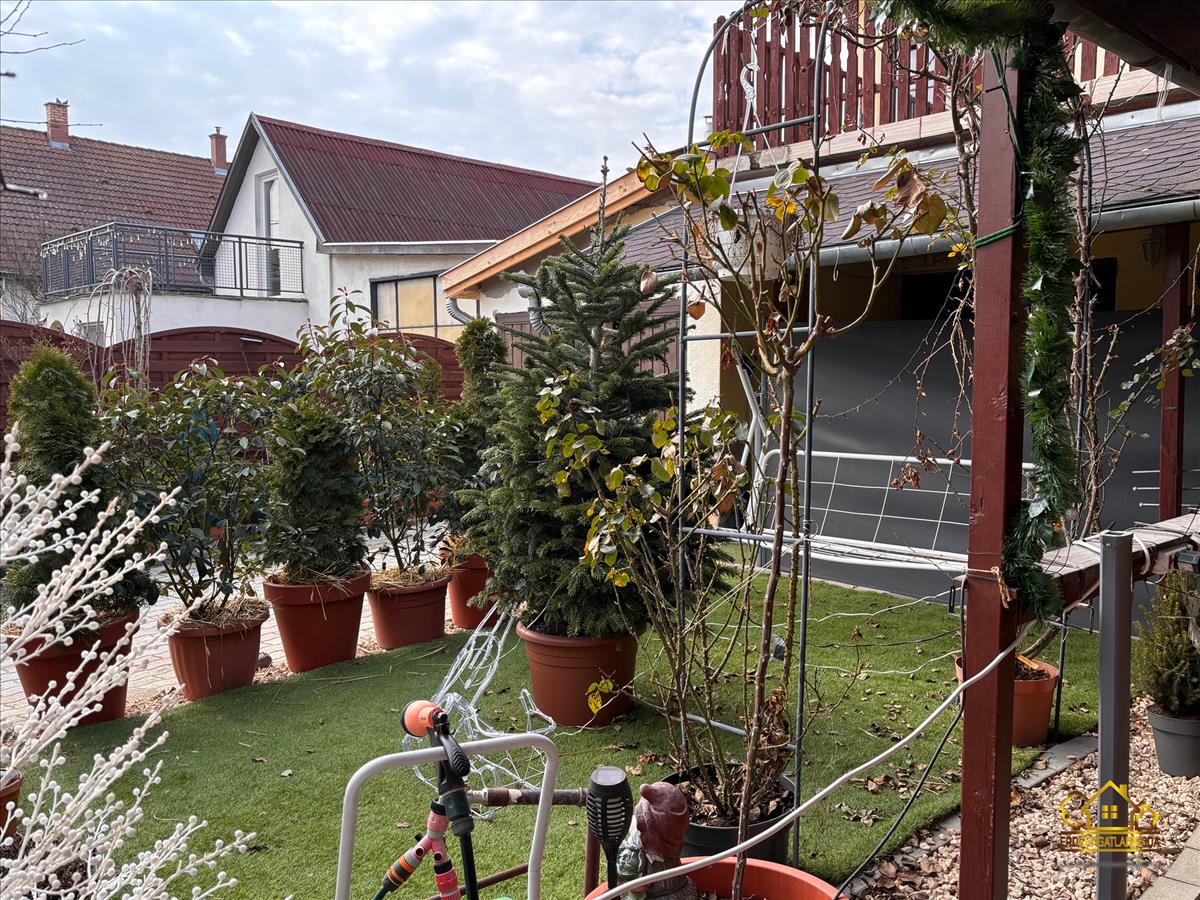 A parkosított telek nagysága 197 m², a kocsibeálló térkövezett, az automata kapun keresztül 2 autó számára kényelmes a parkolás.