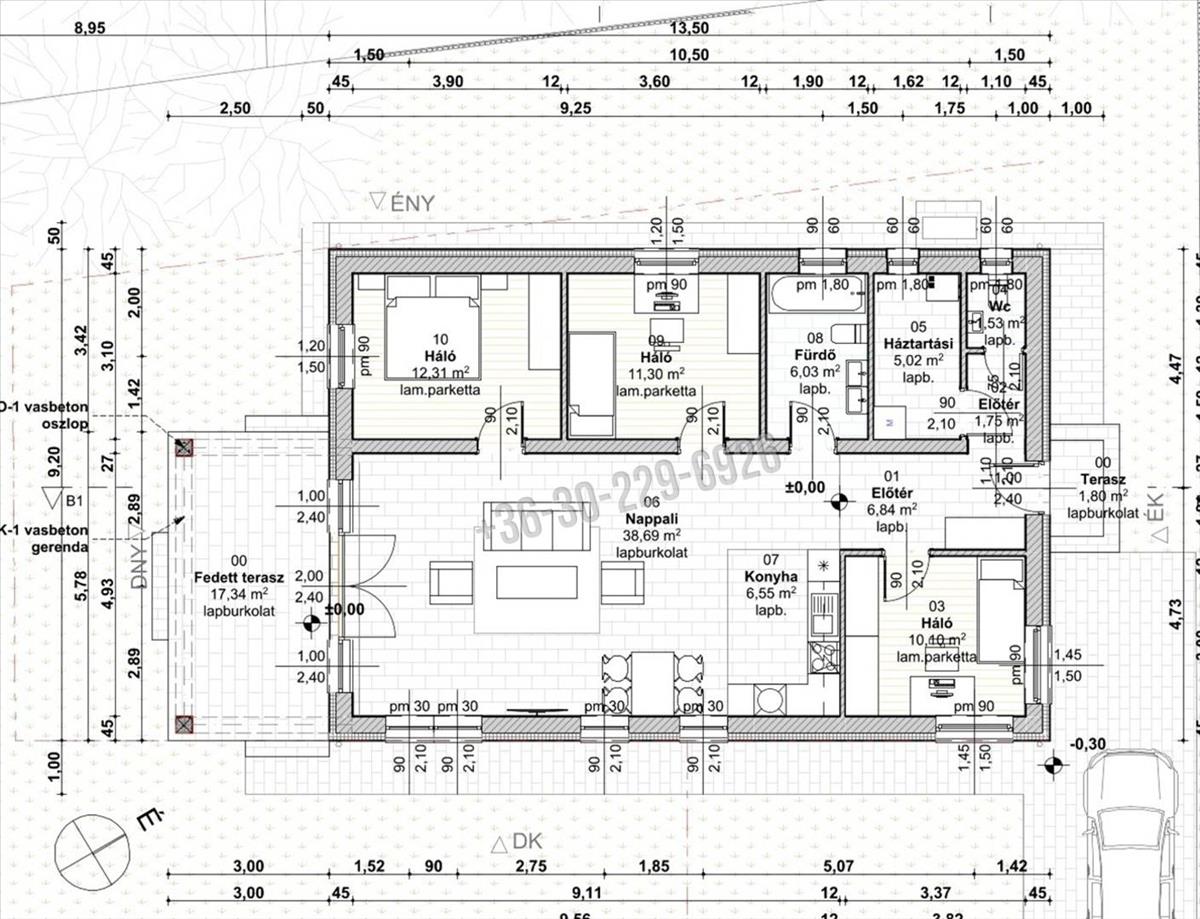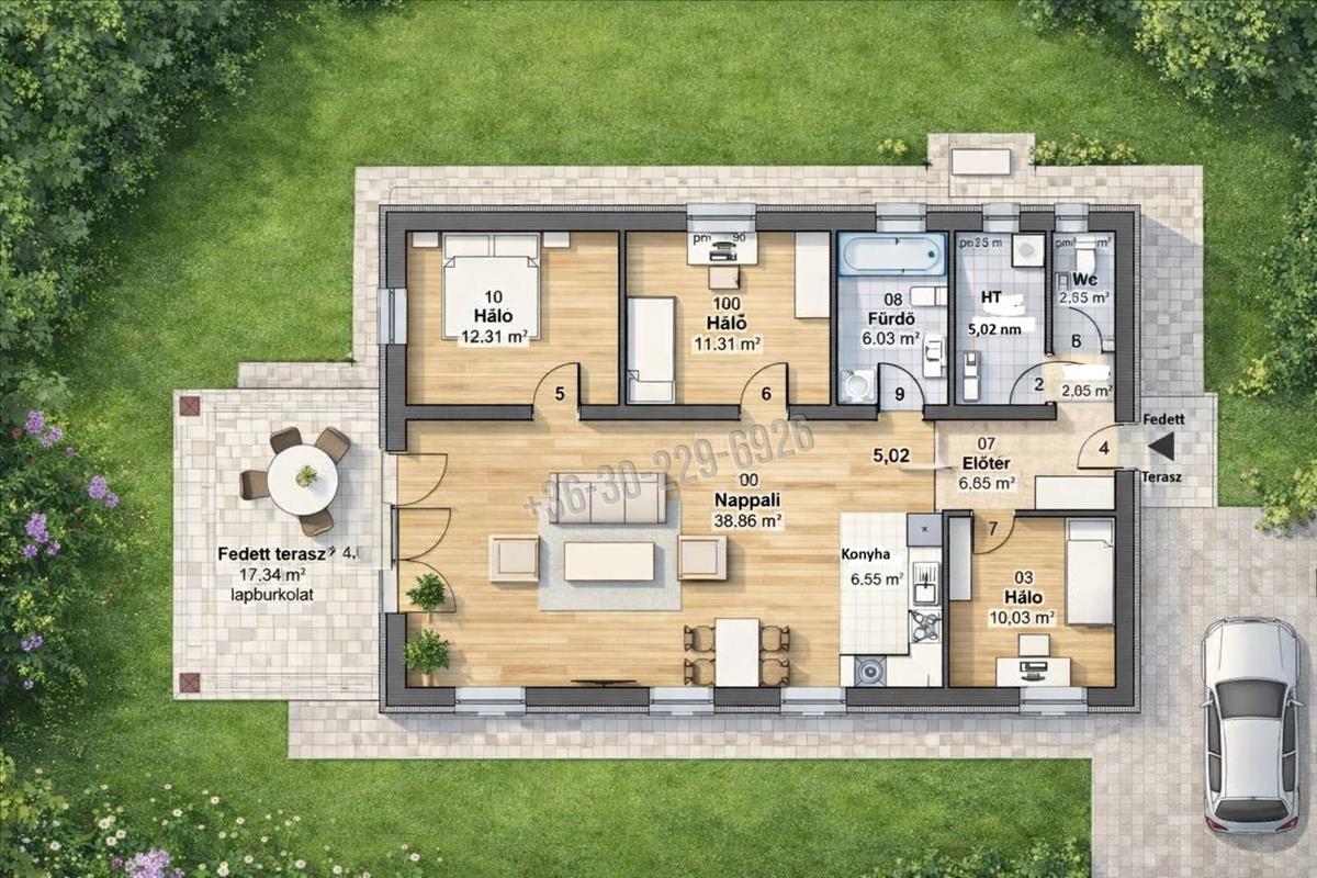Elrendezése: előtér, 45 nm amerikai konyha-nappali, 3 szoba, fürdőszoba wc-vel, külön wc, háztartási helyiség, 17, 5 nm fedett terasz.