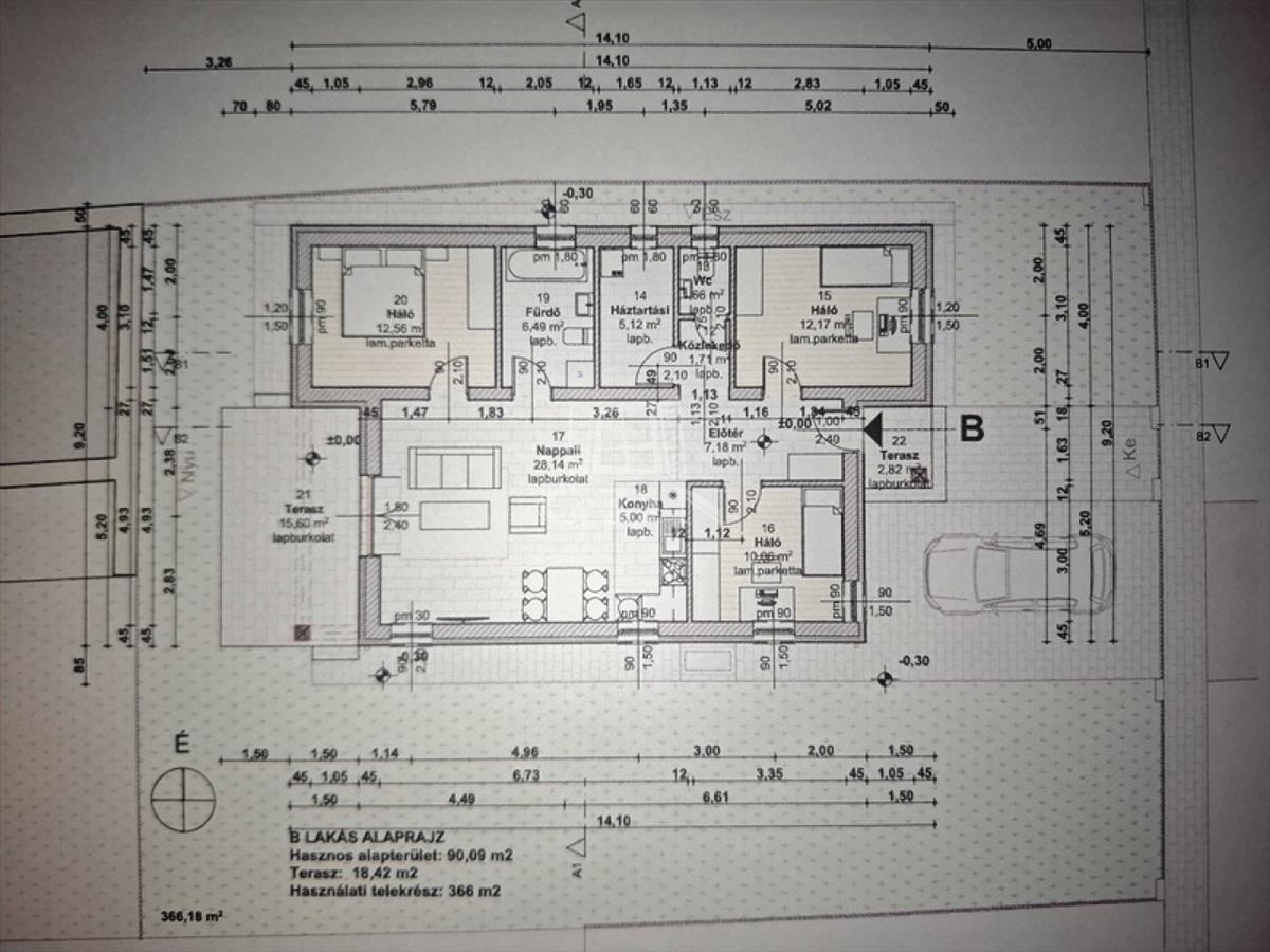Az otthon helyiségei:nappali teraszkapcsolattal 28, 14 nm, konyha 5, 00 nm, szoba 10, 06 nm, szoba 12, 17 nm, szoba 12, 56 nm, fürdőszoba 6, 49 nm, háztartási h 5, 12 nm, wc 1, 66 nm, közlekedő 1, 77 nm, terasz 18, 42 nm.