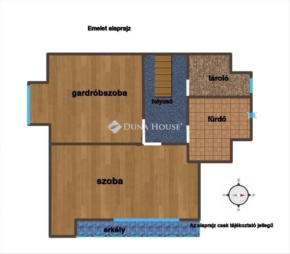 Az emeletre szép, egyedi fa lépcső vezet fel, a tetőtérben pedig hangulatos, erkélyes szoba biztosítja a pihenésre alkalmas teret. a felső szinten is van külön fürdőszoba, zuhanykabinnal, WC-vel.