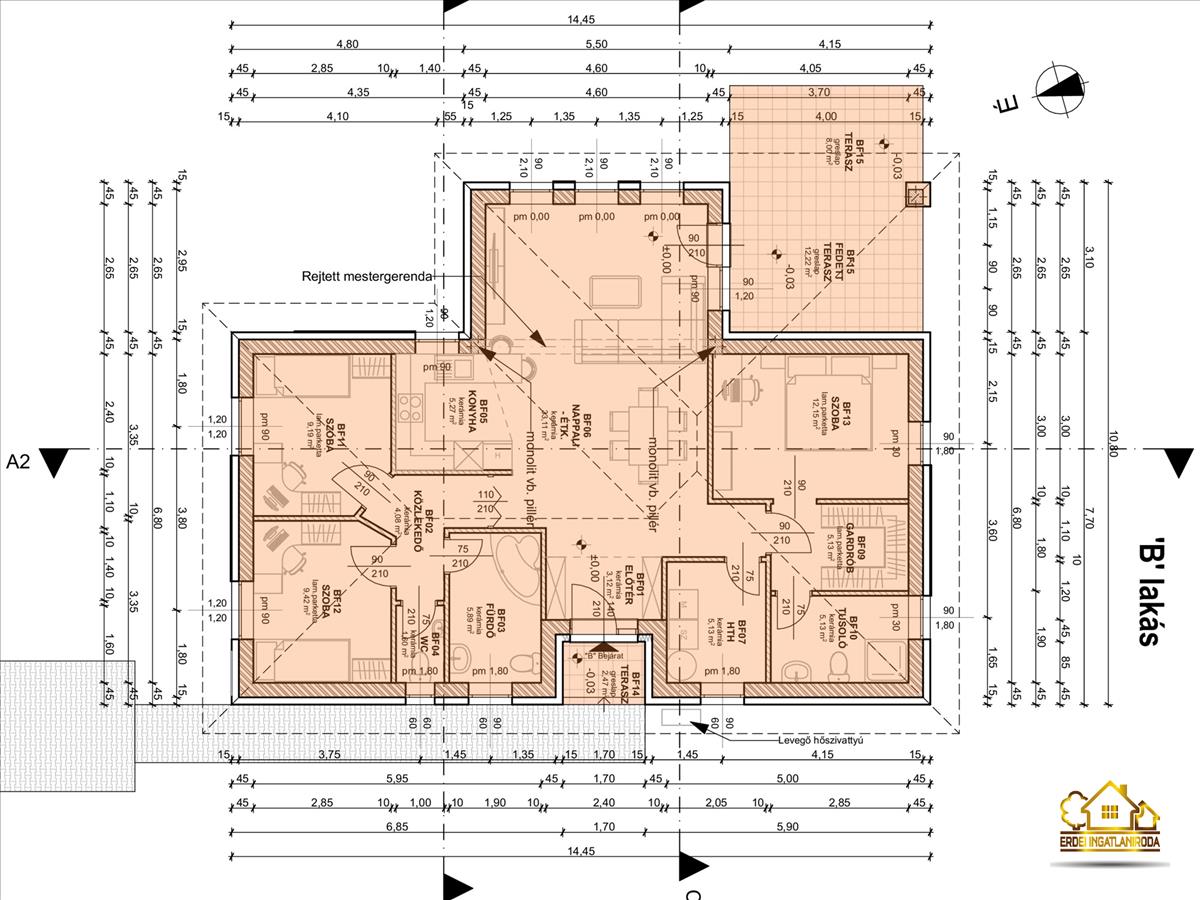 A lakás belső elrendezése rendkívül praktikus és kényelmes 3 hálószoba, gardrób, fürdőszoba, külön wc helyiség, háztartási helyiség, közlekedő és előszoba áll rendelkezésre. a tágas amerikai konyhás nappaliból egy 20 m²-es fedett teraszra jutunk.
