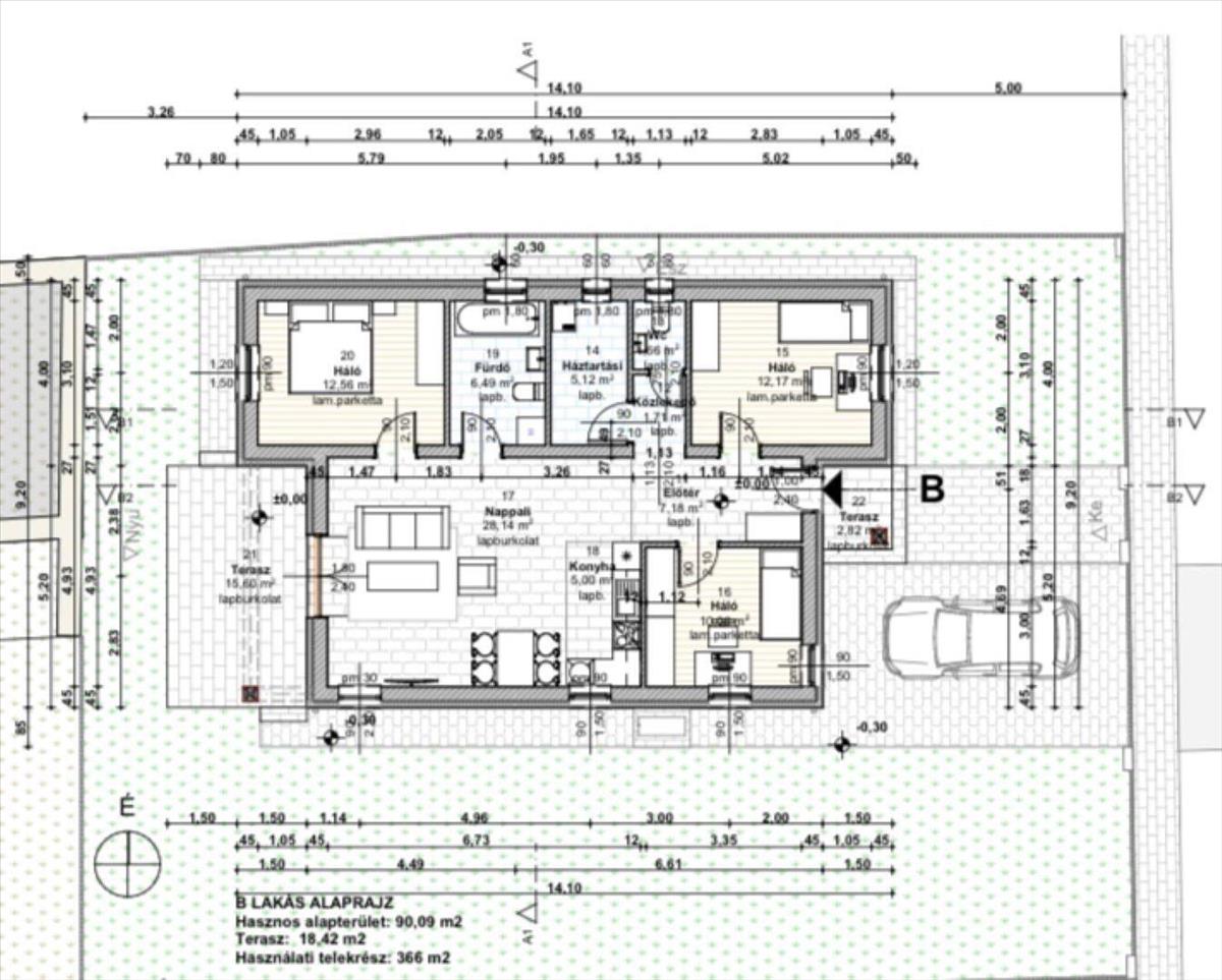 Élhető elrendezés: 3 különnyíló hálószoba, tágas amerikai konyhás nappali teraszkapcsolattal, fürdőszoba, külön wc és egy praktikus háztartási helyiség.