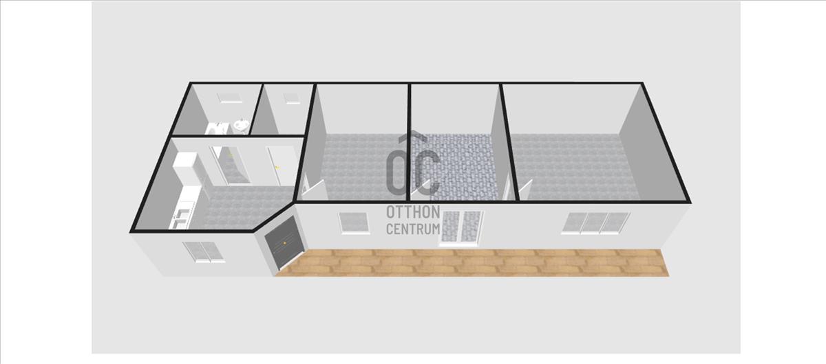 Az utcáról az udvaron át megközelíthető házba, a kis fedett teraszról léphetünk, a konyha-étkezőbe, melyből a mosdó, a spejz, és egymást követően a szobák érhetők el.