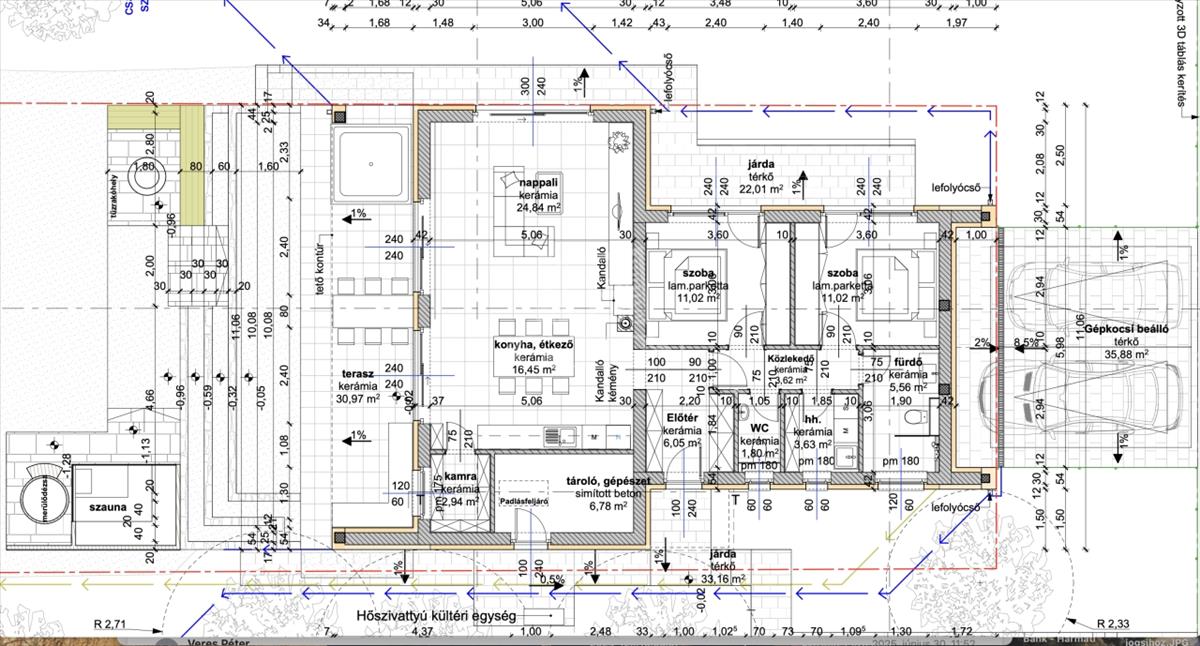 A ház 94 m2, tartozik hozzá még 30, 97 m2 terasz és 35, 88 m2 autóbeálló.