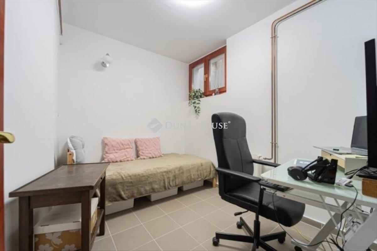 Az alsó szinten a kétállásos garázs mellett 2 szoba, tárolók, mosókonyha, toalett kapott helyet. Világos, ablakos helyiségek, akár egy külön lakás kialakítására is alkalmas. Jelenleg a tulajdonosok irodaként használják.