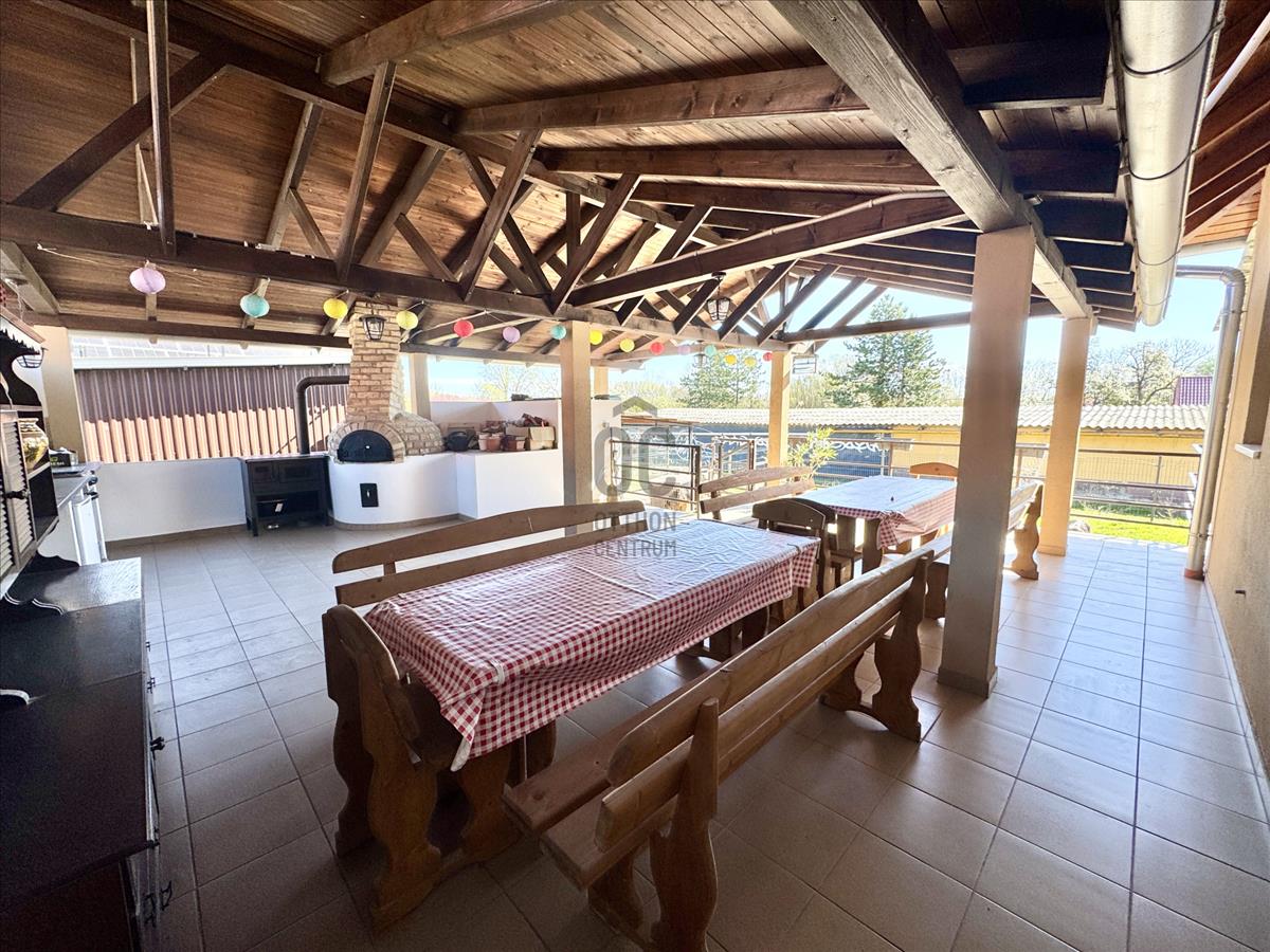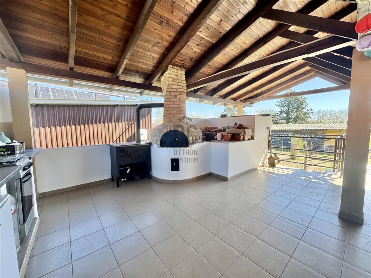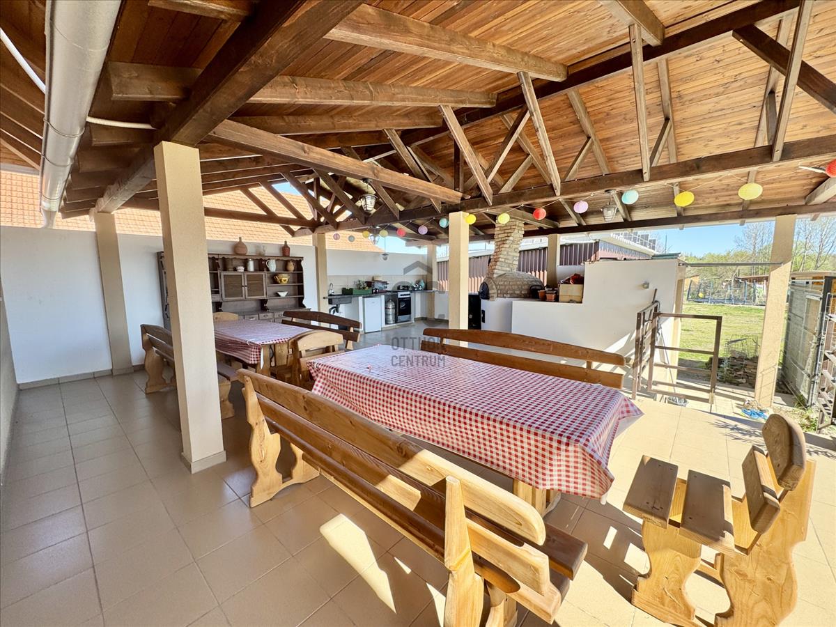 -3 terasz van a ház mellett, amiből a legnagyobb, egy 80m2-es nyári konyha 20 fős asztallal, épített kemencével, sparhelttel