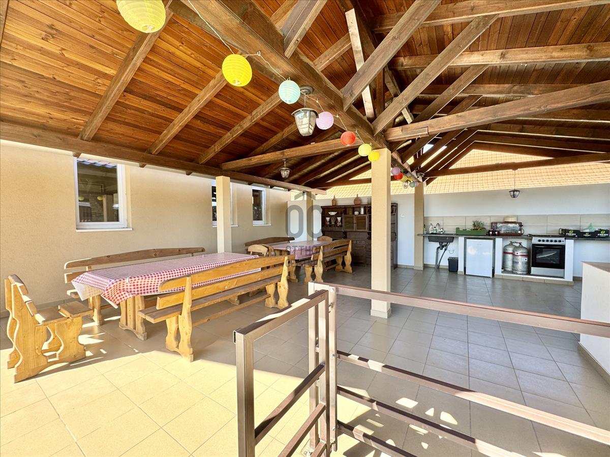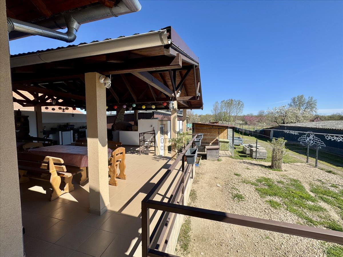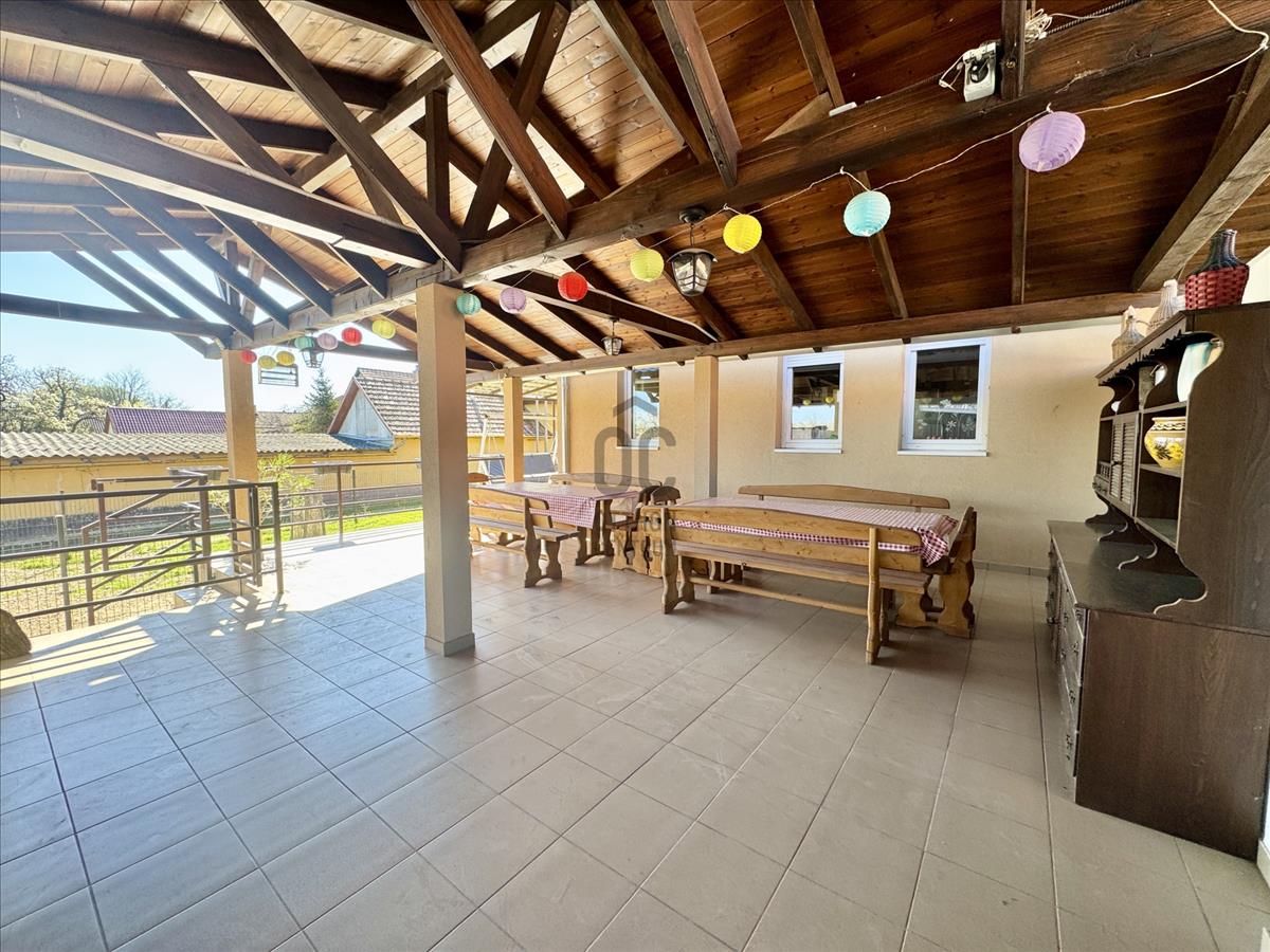 -3 terasz van a ház mellett, amiből a legnagyobb, egy 80m2-es nyári konyha 20 fős asztallal, épített kemencével, sparhelttel