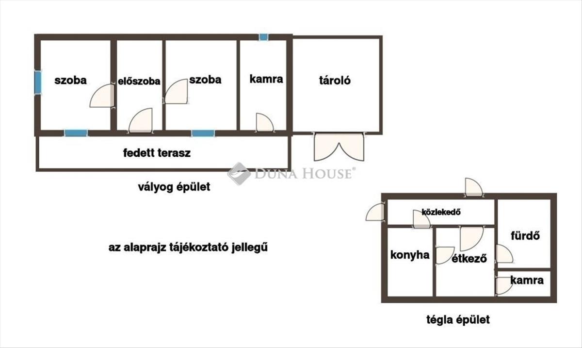 - 2 szoba, konyha, kamra és tároló helyiségekből áll