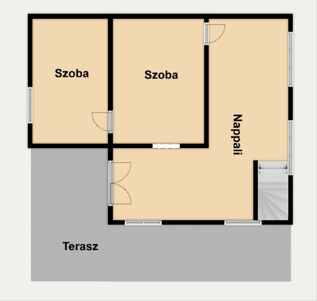 Az emelet különlegessége, hogy két irányból is megközelíthető: a belső lépcsőn keresztül, illetve a teraszon át kívülről is fel lehet jutni. a felső szinten egy teraszkapcsolatos nappali, és 2 szoba található.